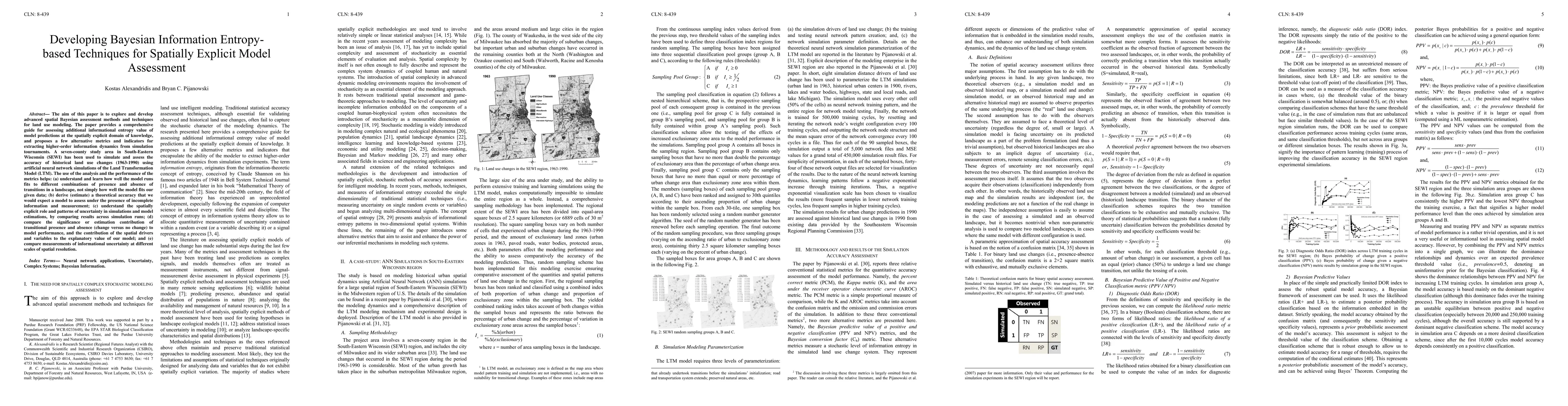 The aim of this paper is to explore and develop advanced spatial Bayesian assessment methods and techniques for land use modeling. The paper provides a comprehensive guide for assessing additional informational entropy value of model predictions at the spatially explicit domain of knowledge, and proposes a few alternative metrics and indicators for extracting higher-order information dynamics from simulation tournaments. A seven-county study area in South-Eastern Wisconsin (SEWI) has been used to simulate and assess the accuracy of historical land use changes (1963-1990) using artificial neural network simulations of the Land Transformation Model (LTM). The use of the analysis and the performance of the metrics helps: (a) understand and learn how well the model runs fits to different combinations of presence and absence of transitions in a landscape, not simply how well the model fits our given data; (b) derive (estimate) a theoretical accuracy that we would expect a model to assess under the presence of incomplete information and measurement; (c) understand the spatially explicit role and patterns of uncertainty in simulations and model estimations, by comparing results across simulation runs; (d) compare the significance or estimation contribution of transitional presence and absence (change versus no change) to model performance, and the contribution of the spatial drivers and variables to the explanatory value of our model; and (e) compare measurements of informational uncertainty at different scales of spatial resolution.