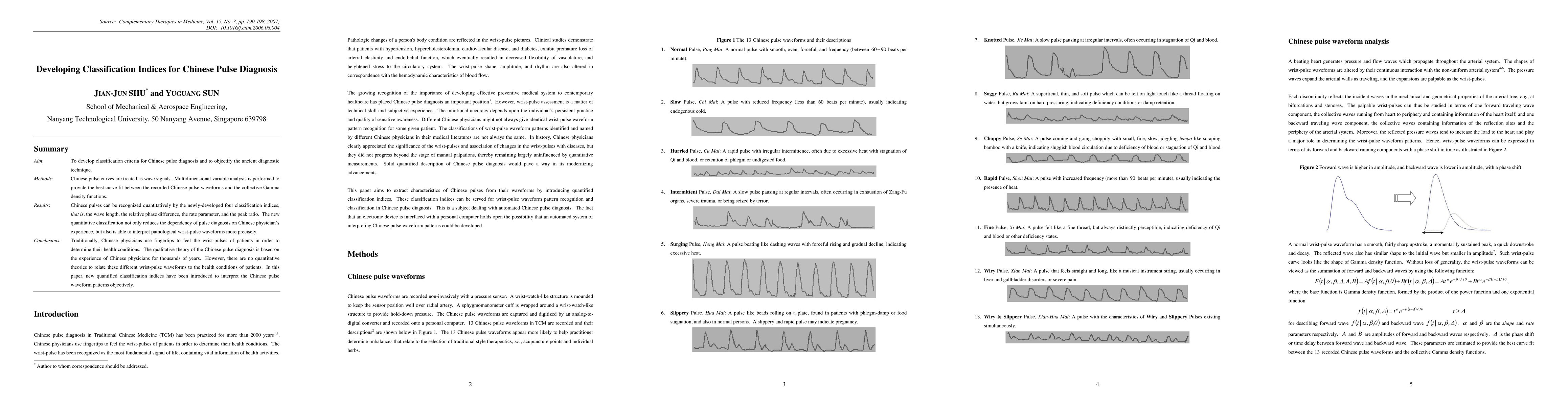 Aim: To develop classification criteria for Chinese pulse diagnosis and to objectify the ancient diagnostic technique. Methods: Chinese pulse curves are treated as wave signals. Multidimensional variable analysis is performed to provide the best curve fit between the recorded Chinese pulse waveforms and the collective Gamma density functions. Results: Chinese pulses can be recognized quantitatively by the newly-developed four classification indices, that is, the wave length, the relative phase difference, the rate parameter, and the peak ratio. The new quantitative classification not only reduces the dependency of pulse diagnosis on Chinese physician's experience, but also is able to interpret pathological wrist-pulse waveforms more precisely. Conclusions: Traditionally, Chinese physicians use fingertips to feel the wrist-pulses of patients in order to determine their health conditions. The qualitative theory of the Chinese pulse diagnosis is based on the experience of Chinese physicians for thousands of years. However, there are no quantitative theories to relate these different wrist-pulse waveforms to the health conditions of patients. In this paper, new quantified classification indices have been introduced to interpret the Chinese pulse waveform patterns objectively.