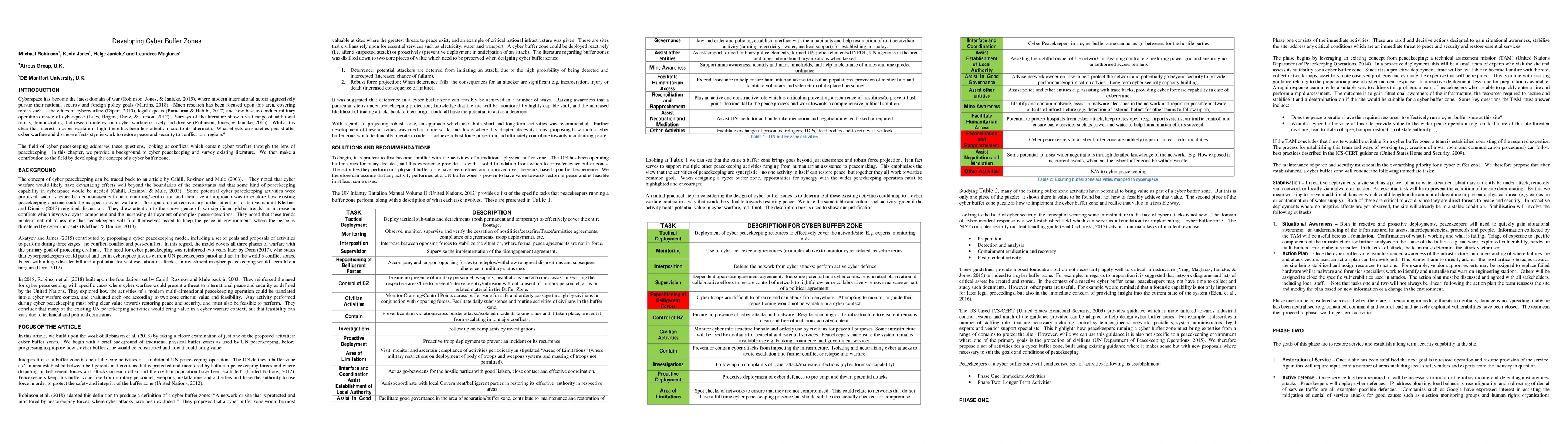 The United Nations conducts peace operations around the world, aiming tomaintain peace and security in conflict torn areas. Whilst early operations werelargely successful, the changing nature of warfare and conflict has often left peaceoperations strugglingto adapt. In this article, we make a contribution towardsefforts to plan for the next evolution in both intra and inter-state conflict: cyberwarfare. It is now widely accepted that cyber warfare will be a component offuture conflicts, and much researchhas been devoted to how governments andmilitaries can prepare for and fight in this new domain [1]. Despite the vastamount of research relating to cyber warfare, there has been less discussion onits impact towards successful peace operations. This is agap in knowledge thatis important to address, since the restoration of peace following conflict of anykind is of global importance. It is however a complex topic requiring discussionacross multiple domains. Input from the technical, political, governmental andsocietal domains are critical in forming the concept of cyber peacekeeping.Previous work on this topic has sought to define the concept of cyber peacekeeping[2, 3, 4]. We build upon this work by exploring the practicalities ofstarting up a cyber peacekeeping component and setting up a Cyber Buffer Zone (CBZ).