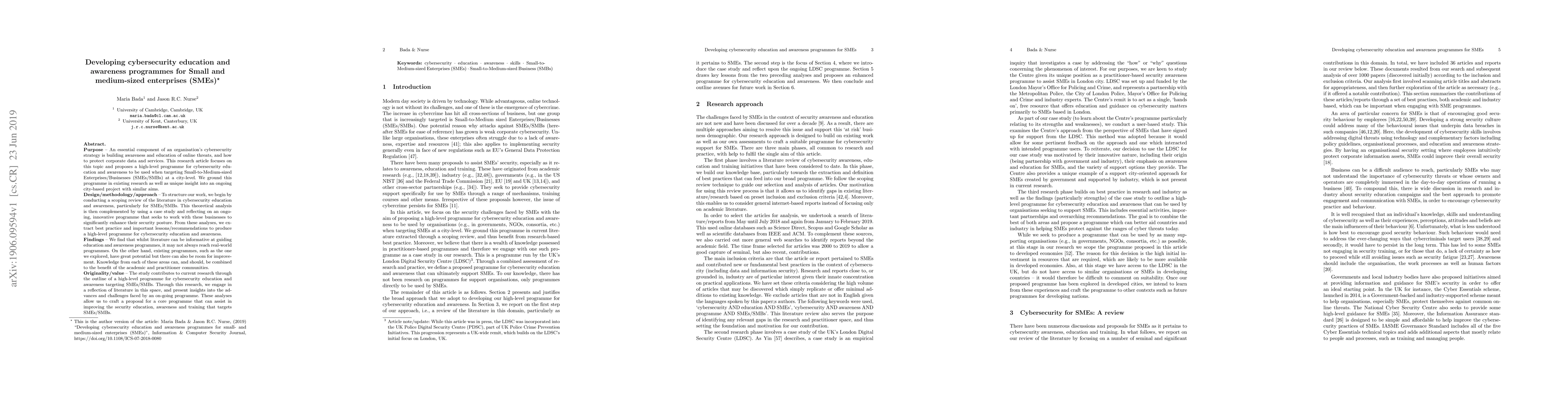 Purpose: An essential component of an organisation's cybersecurity strategy is building awareness and education of online threats, and how to protect corporate data and services. This research article focuses on this topic and proposes a high-level programme for cybersecurity education and awareness to be used when targeting Small-to-Medium-sized Enterprises/Businesses (SMEs/SMBs) at a city-level. We ground this programme in existing research as well as unique insight into an ongoing city-based project with similar aims. Findings: We find that whilst literature can be informative at guiding education and awareness programmes, it may not always reach real-world programmes. On the other hand, existing programmes, such as the one we explored, have great potential but there can also be room for improvement. Knowledge from each of these areas can, and should, be combined to the benefit of the academic and practitioner communities. Originality/value: The study contributes to current research through the outline of a high-level programme for cybersecurity education and awareness targeting SMEs/SMBs. Through this research, we engage in a reflection of literature in this space, and present insights into the advances and challenges faced by an on-going programme. These analyses allow us to craft a proposal for a core programme that can assist in improving the security education, awareness and training that targets SMEs/SMBs.