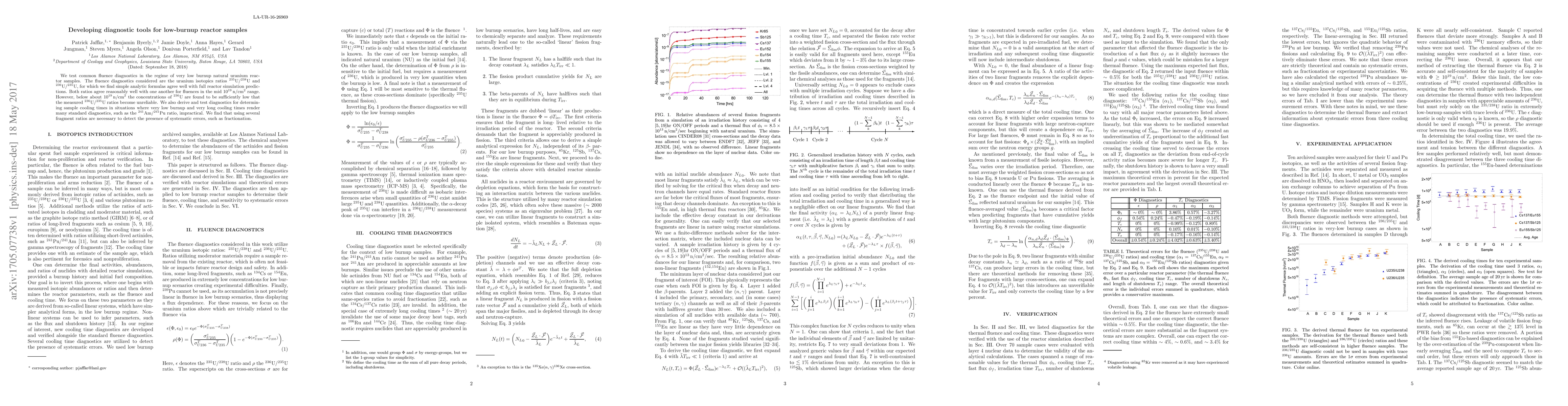 We test common fluence diagnostics in the regime of very low burnup natural uranium reactor samples. The fluence diagnostics considered are the uranium isotopics ratios $^{235}$U/$^{238}$U and $^{236}$U/$^{235}$U, for which we find simple analytic formulas agree well with full reactor simulation predictions. Both ratios agree reasonably well with one another for fluences in the mid $10^{19}\,\mathrm{n/cm^2}$ range. However, below about $10^{19}\,\mathrm{n/cm^2}$ the concentrations of $^{236}$U are found to be sufficiently low that the measured $^{236}$U/$^{235}$U ratios become unreliable. We also derive and test diagnostics for determining sample cooling times in situations where very low burnup and very long cooling times render many standard diagnostics, such as the $^{241}$Am/$^{241}$Pu ratio, impractical. We find that using several fragment ratios are necessary to detect the presence of systematic errors, such as fractionation.