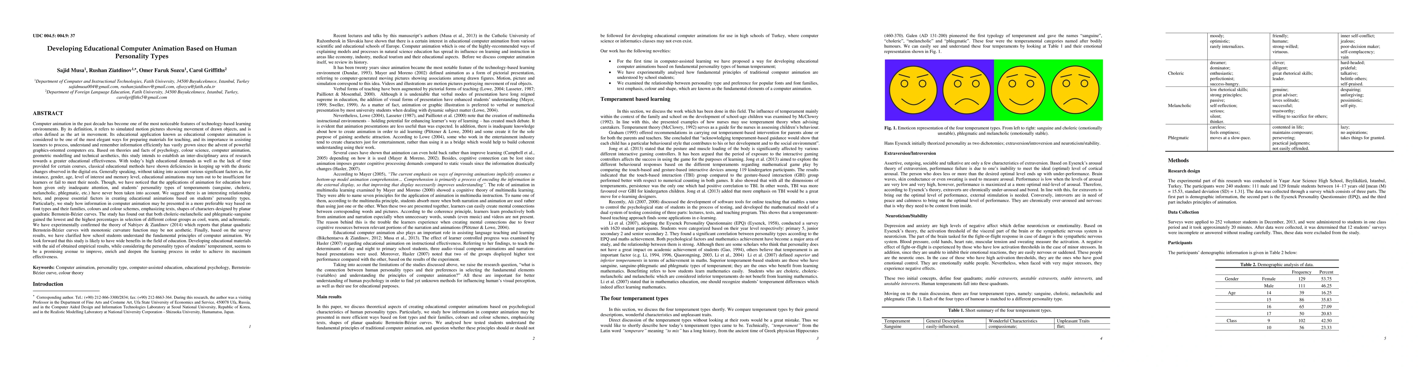 This paper explores the development of educational computer animations tailored to students' personality types to enhance learning efficiency. It argues that current educational animations lack personalization, and suggests that incorporating personality factors could significantly improve educational outcomes.