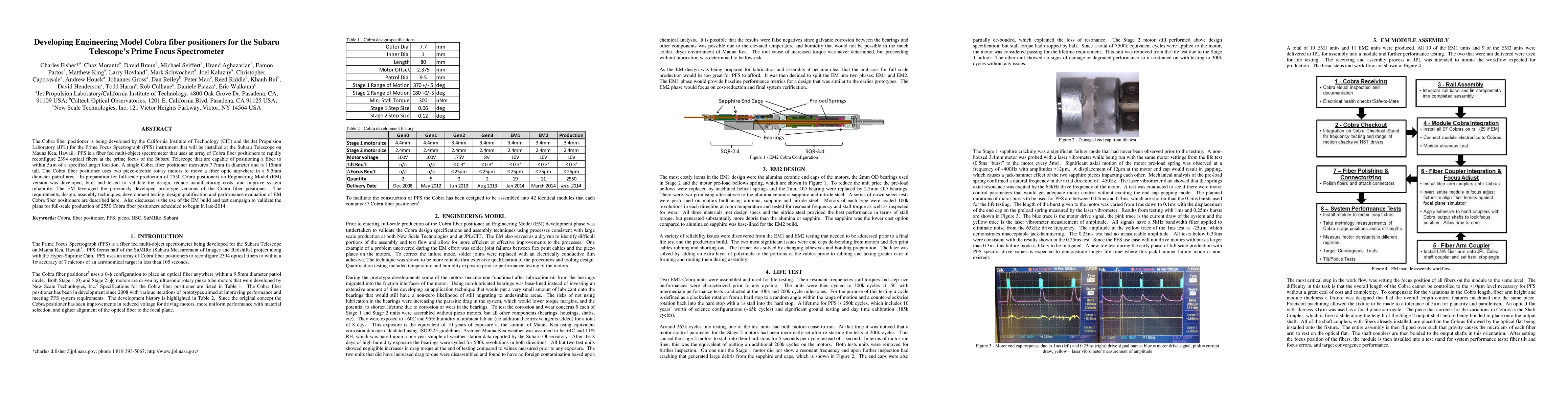 The Cobra fiber positioner, developed by Caltech and JPL, is designed for the Subaru Telescope's Prime Focus Spectrograph, enabling precise fiber positioning within 5µm. An Engineering Model was created to validate the design, reduce costs, and enhance reliability before full-scale production of 2550 units.
