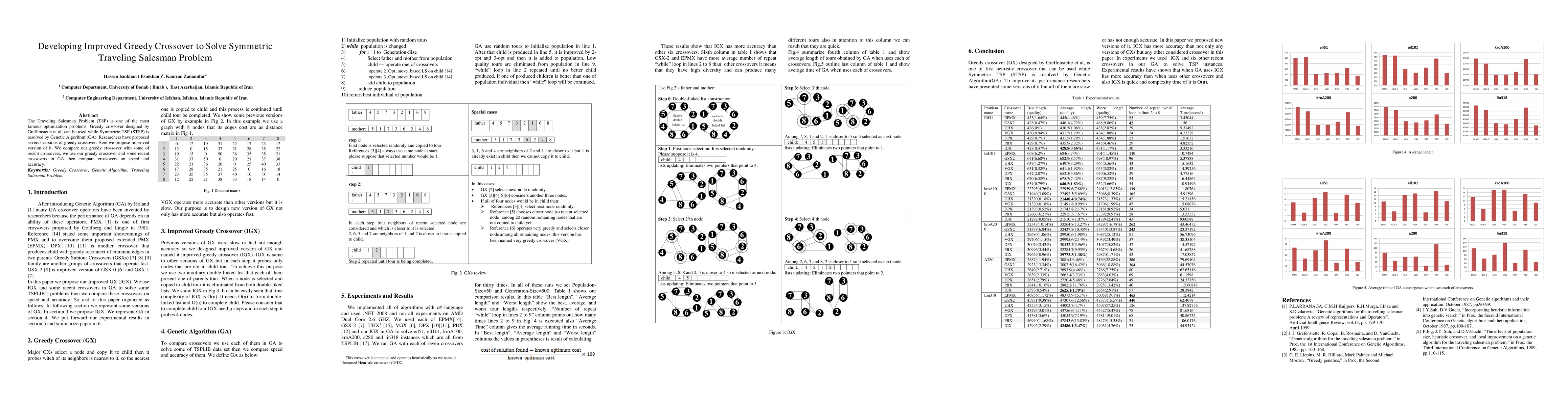 This paper proposes an improved version of the Greedy Crossover algorithm for solving the Symmetric Traveling Salesman Problem (STSP) using Genetic Algorithm (GA). The authors compare their improved crossover with recent versions in terms of both speed and accuracy.
