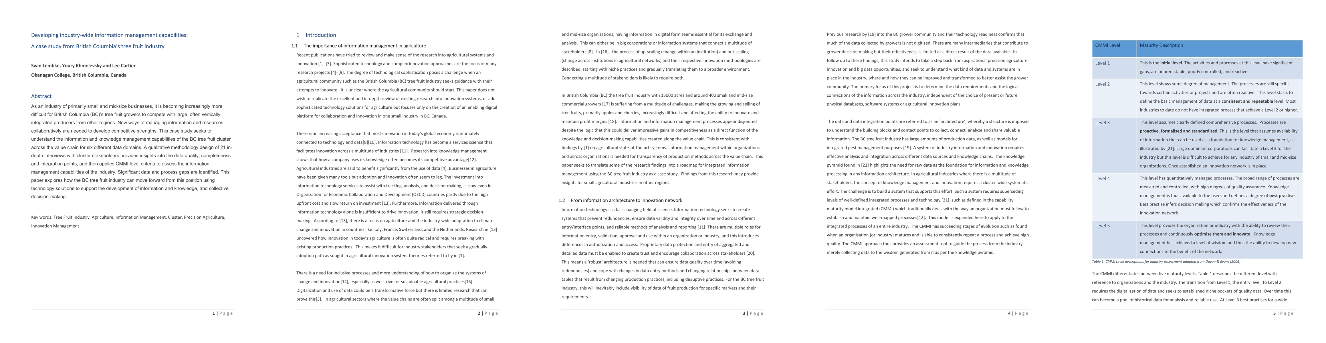 As an industry of primarily small and mid-size businesses, it is becoming increasingly more difficult for British Columbia (BC)'s tree fruit growers to compete with large, often vertically integrated producers from other regions. New ways of managing information and resources collaboratively are needed to develop competitive strengths. This case study seeks to understand the information and knowledge management capabilities of the BC tree fruit cluster across the value chain for six different data domains. A qualitative methodology design of 21 in-depth interviews with cluster stakeholders provides insights into the data quality, completeness and integration points, and then applies CMMI level criteria to assess the information management capabilities of the industry. Significant data and process gaps are identified. This paper explores how the BC tree fruit industry can move forward from this position using technology solutions to support the development of information and knowledge, and collective decision-making.