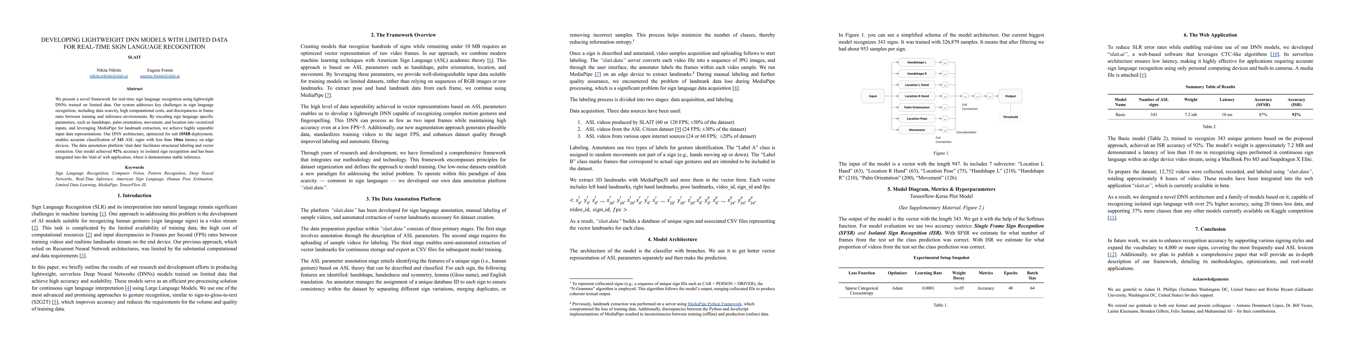 We present a novel framework for real-time sign language recognition using lightweight DNNs trained on limited data. Our system addresses key challenges in sign language recognition, including data scarcity, high computational costs, and discrepancies in frame rates between training and inference environments. By encoding sign language specific parameters, such as handshape, palm orientation, movement, and location into vectorized inputs, and leveraging MediaPipe for landmark extraction, we achieve highly separable input data representations. Our DNN architecture, optimized for sub 10MB deployment, enables accurate classification of 343 signs with less than 10ms latency on edge devices. The data annotation platform 'slait data' facilitates structured labeling and vector extraction. Our model achieved 92% accuracy in isolated sign recognition and has been integrated into the 'slait ai' web application, where it demonstrates stable inference.