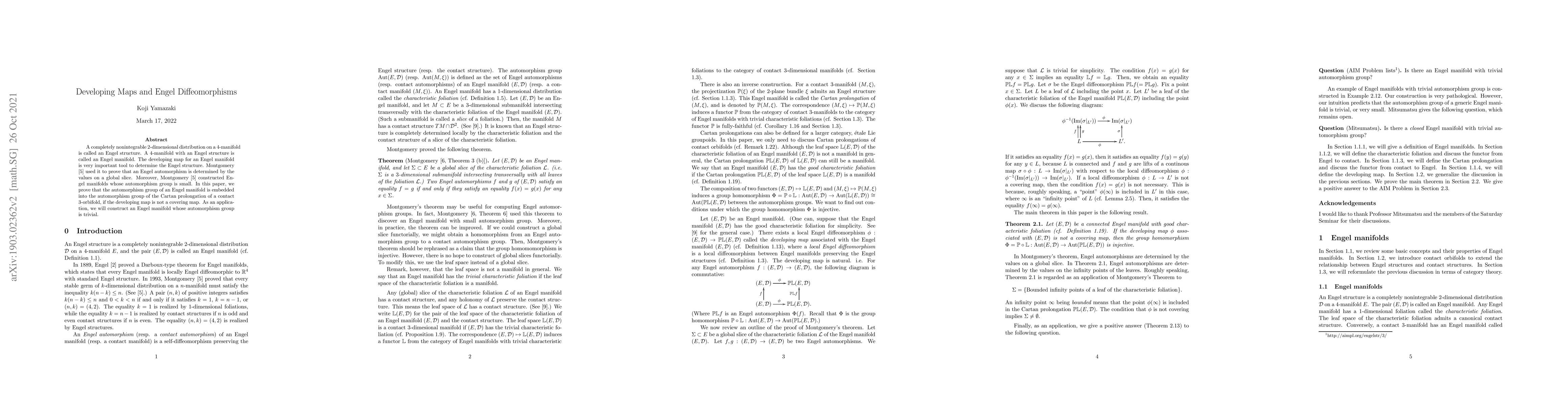 This paper explores Engel structures on $4$-manifolds and their developing maps, proving that the automorphism group of an Engel manifold embeds into the automorphism group of the Cartan prolongation of a contact $3$-orbifold when the developing map is not a covering map. An application constructs an Engel manifold with a trivial automorphism group.