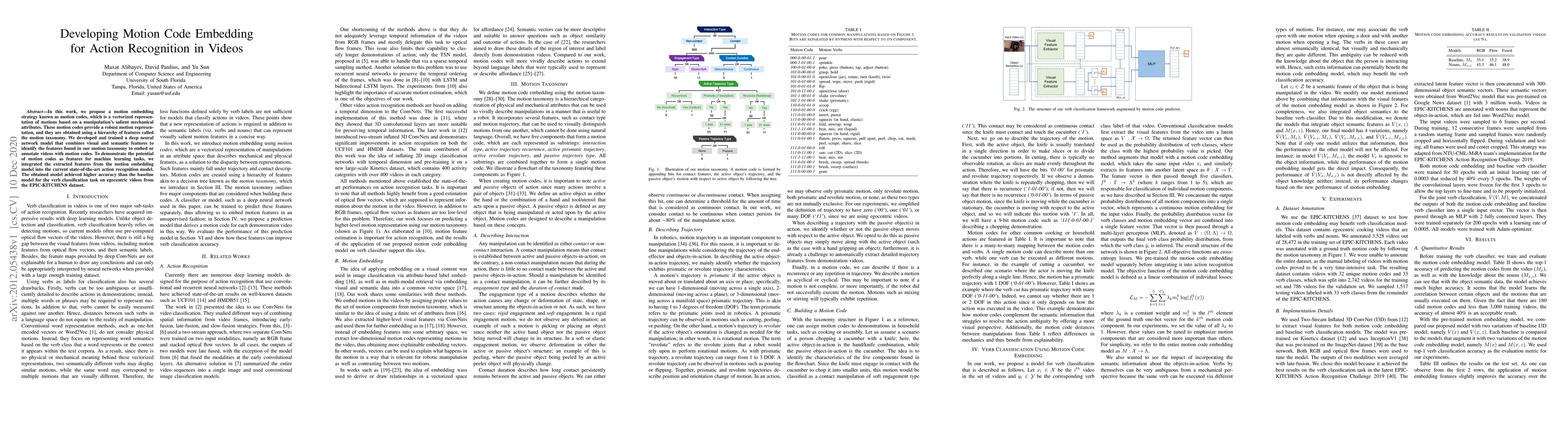 In this work, we propose a motion embedding strategy known as motion codes, which is a vectorized representation of motions based on a manipulation's salient mechanical attributes. These motion codes provide a robust motion representation, and they are obtained using a hierarchy of features called the motion taxonomy. We developed and trained a deep neural network model that combines visual and semantic features to identify the features found in our motion taxonomy to embed or annotate videos with motion codes. To demonstrate the potential of motion codes as features for machine learning tasks, we integrated the extracted features from the motion embedding model into the current state-of-the-art action recognition model. The obtained model achieved higher accuracy than the baseline model for the verb classification task on egocentric videos from the EPIC-KITCHENS dataset.