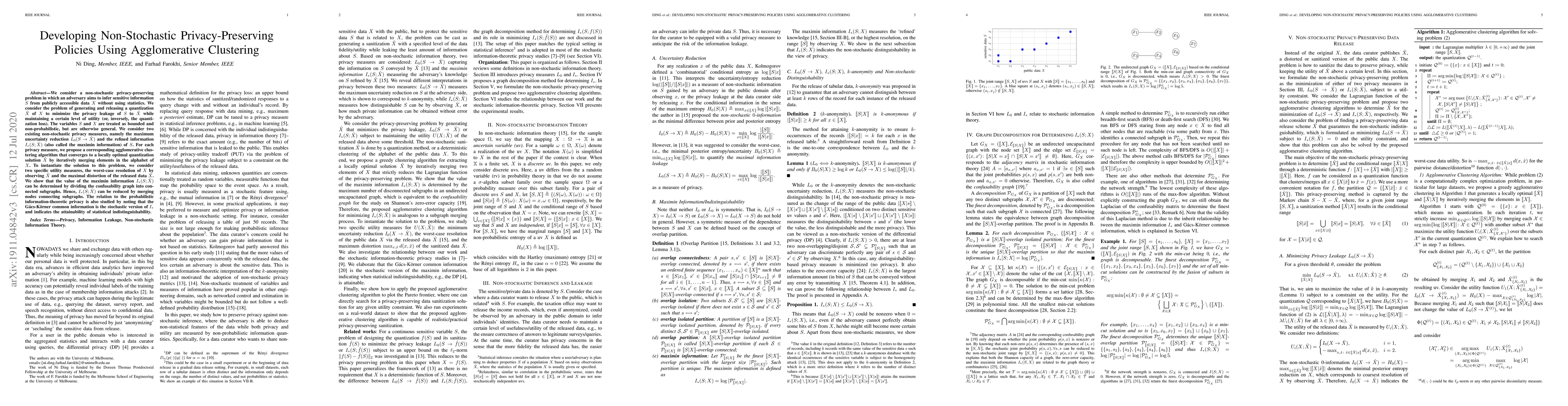 Researchers propose a new method using agglomerative clustering to develop privacy-preserving policies that minimize leakage of sensitive information from publicly accessible data while maintaining utility. By dividing the confusability graph into connected subgraphs, they can reduce the maximin information, a measure of statistical distinguishability.