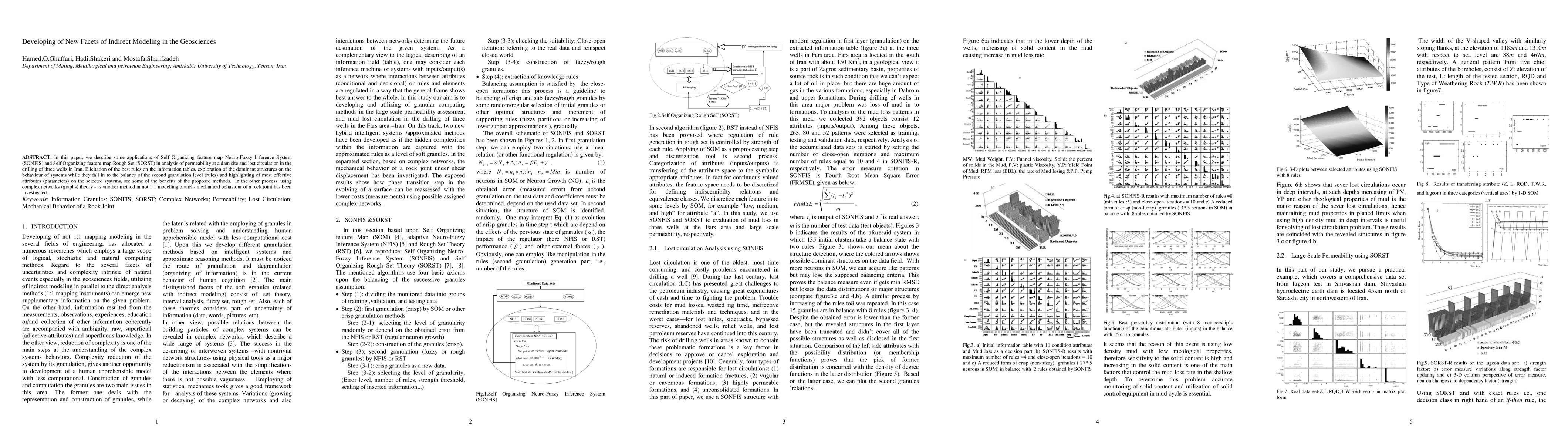 In this paper, we describe some applications of Self Organizing feature map Neuro-Fuzzy Inference System (SONFIS) and Self Organizing feature map Rough Set (SORST) in analysis of permeability at a dam site and lost circulation in the drilling of three wells in Iran. Elicitation of the best rules on the information tables, exploration of the dominant structures on the behaviour of systems while they fall in to the balance of the second granulation level (rules) and highlighting of most effective attributes (parameters) on the selected systems, are some of the benefits of the proposed methods. In the other process, using complex networks (graphs) theory - as another method in not 1:1 modelling branch- mechanical behaviour of a rock joint has been investigated. Keywords: Information Granules; SONFIS; SORST; Complex Networks; Permeability; Lost Circulation; Mechanical Behavior of a Rock Joint