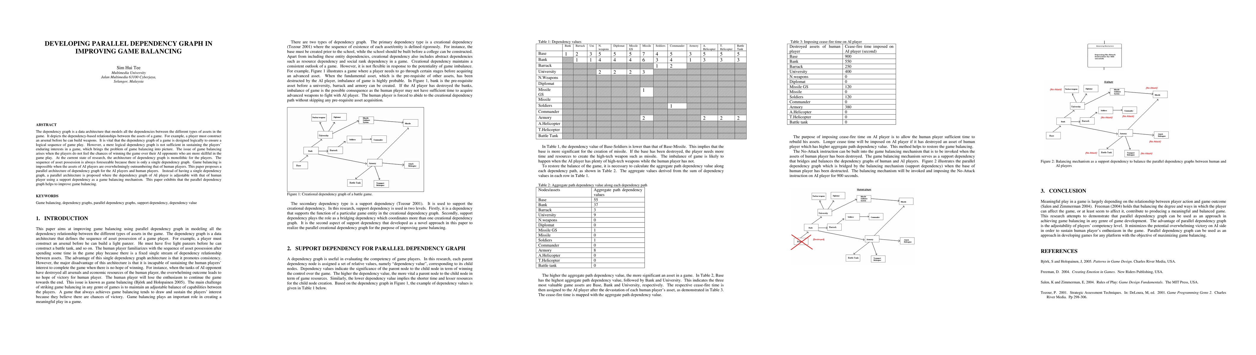 This paper proposes a parallel dependency graph architecture to improve game balancing by allowing adjustable dependency graphs for AI and human players, using a support dependency mechanism to balance the chances of winning between players. The parallel structure aims to address the issue of game imbalance when AI players possess significantly more assets than human players.