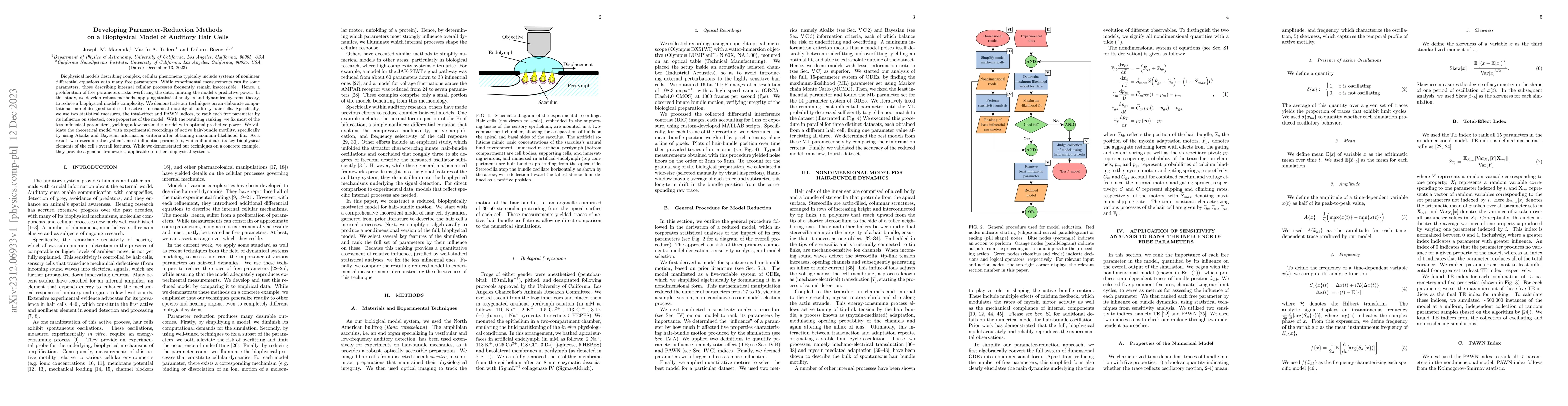 This paper develops parameter-reduction methods for a biophysical model of auditory hair cells, employing statistical analysis and dynamical-systems theory to identify and fix less influential parameters. The techniques are validated using experimental data, revealing key biophysical elements and providing a general framework for other complex cellular models.