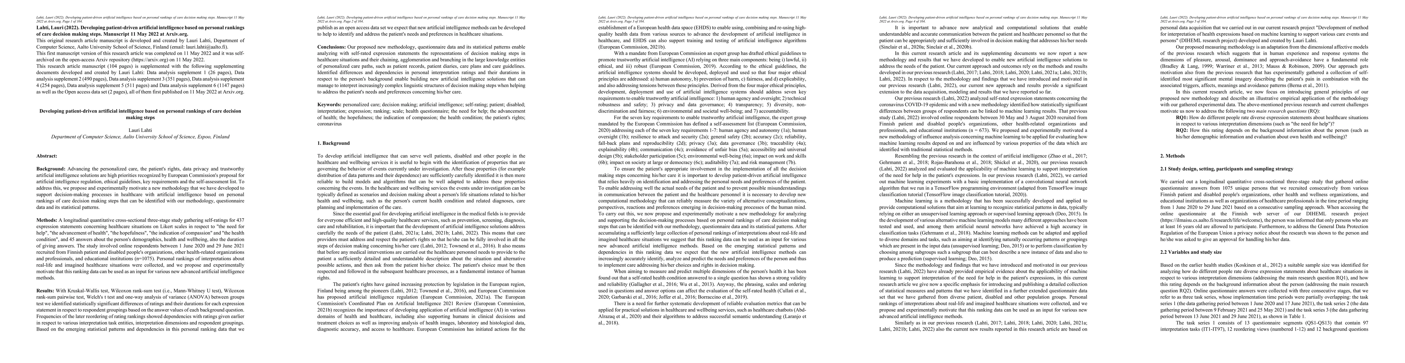 We propose and experimentally motivate a new methodology to support decision-making processes in healthcare with artificial intelligence based on personal rankings of care decision making steps that can be identified with our methodology, questionnaire data and its statistical patterns. Our longitudinal quantitative cross-sectional three-stage study gathered self-ratings for 437 expression statements concerning healthcare situations on Likert scales in respect to "the need for help", "the advancement of health", "the hopefulness", "the indication of compassion" and "the health condition", and 45 answers about the person's demographics, health and wellbeing, also the duration of giving answers. Online respondents between 1 June 2020 and 29 June 2021 were recruited from Finnish patient and disabled people's organizations, other health-related organizations and professionals, and educational institutions (n=1075). With Kruskal-Wallis test, Wilcoxon rank-sum test (i.e., Mann-Whitney U test), Wilcoxon rank-sum pairwise test, Welch's t test and one-way analysis of variance (ANOVA) between groups test we identified statistically significant differences of ratings and their durations for each expression statement in respect to respondent groupings based on the answer values of each background question. Frequencies of the later reordering of rating rankings showed dependencies with ratings given earlier in respect to various interpretation task entities, interpretation dimensions and respondent groupings. Our methodology, questionnaire data and its statistical patterns enable analyzing with self-rated expression statements the representations of decision making steps in healthcare situations and their chaining, agglomeration and branching in knowledge entities of personalized care paths. Our results support building artificial intelligence solutions to address the patient's needs concerning care.