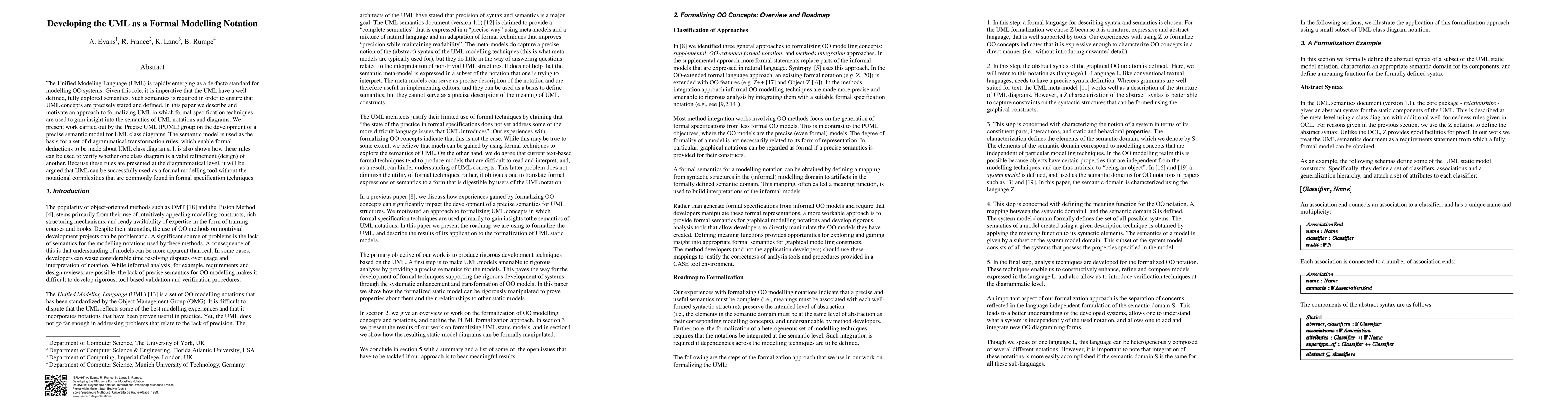 The Unified Modeling Language (UML) is rapidly emerging as a de-facto standard for modelling OO systems. Given this role, it is imperative that the UML have a well- defined, fully explored semantics. Such semantics is required in order to ensure that UML concepts are precisely stated and defined. In this paper we describe and motivate an approach to formalizing UML in which formal specification techniques are used to gain insight into the semantics of UML notations and diagrams. We present work carried out by the Precise UML (PUML) group on the development of a precise semantic model for UML class diagrams. The semantic model is used as the basis for a set of diagrammatical transformation rules, which enable formal deductions to be made about UML class diagrams. It is also shown how these rules can be used to verify whether one class diagram is a valid refinement (design) of another. Because these rules are presented at the diagrammatical level, it will be argued that UML can be successfully used as a formal modelling tool without the notational complexities that are commonly found in formal specification techniques.