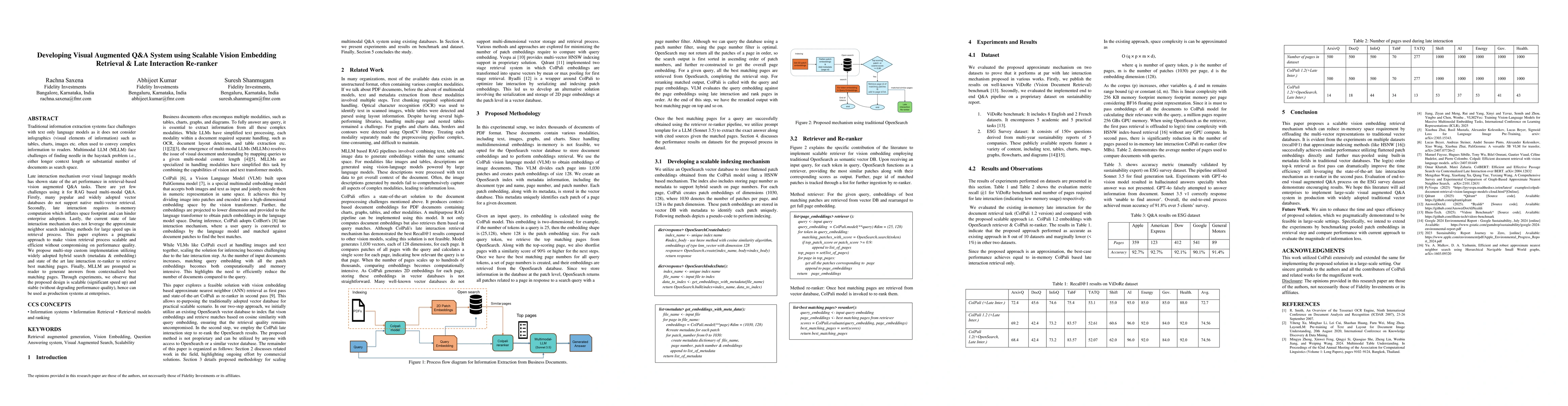 Traditional information extraction systems face challenges with text only language models as it does not consider infographics (visual elements of information) such as tables, charts, images etc. often used to convey complex information to readers. Multimodal LLM (MLLM) face challenges of finding needle in the haystack problem i.e., either longer context length or substantial number of documents as search space. Late interaction mechanism over visual language models has shown state of the art performance in retrieval-based vision augmented Q&A tasks. There are yet few challenges using it for RAG based multi-modal Q&A. Firstly, many popular and widely adopted vector databases do not support native multi-vector retrieval. Secondly, late interaction requires computation which inflates space footprint and can hinder enterprise adoption. Lastly, the current state of late interaction mechanism does not leverage the approximate neighbor search indexing methods for large speed ups in retrieval process. This paper explores a pragmatic approach to make vision retrieval process scalable and efficient without compromising on performance quality. We propose multi-step custom implementation utilizing widely adopted hybrid search (metadata & embedding) and state of the art late interaction re-ranker to retrieve best matching pages. Finally, MLLM are prompted as reader to generate answers from contextualized best matching pages. Through experiments, we observe that the proposed design is scalable (significant speed up) and stable (without degrading performance quality), hence can be used as production systems at enterprises.