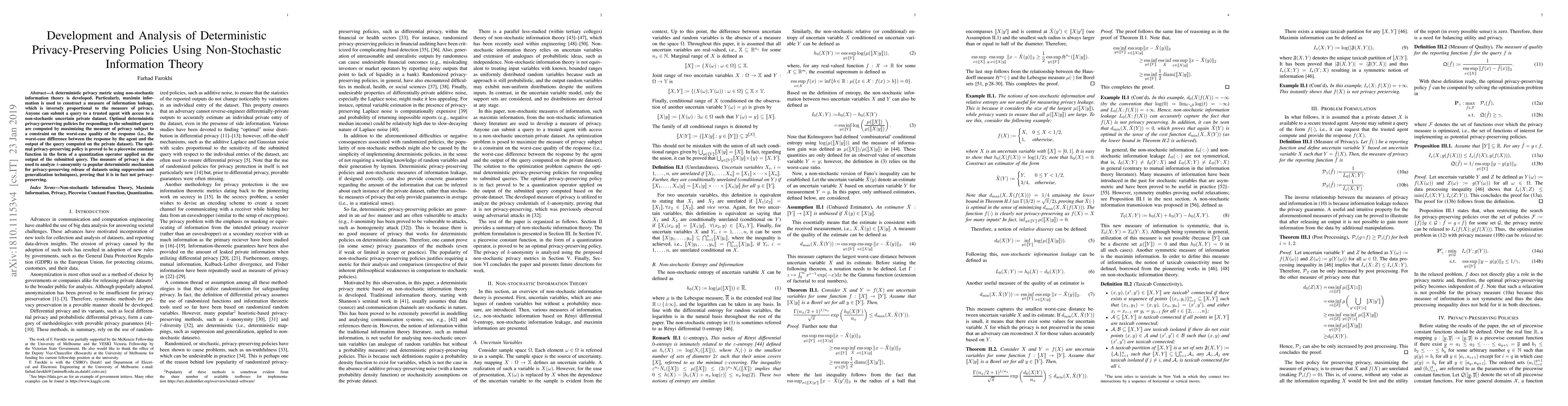 A new metric for privacy is developed using non-stochastic information theory to design optimal policies for protecting private data. The research also analyzes the performance of k-anonymity methodology, finding it not to be a reliable method for maintaining user anonymity.