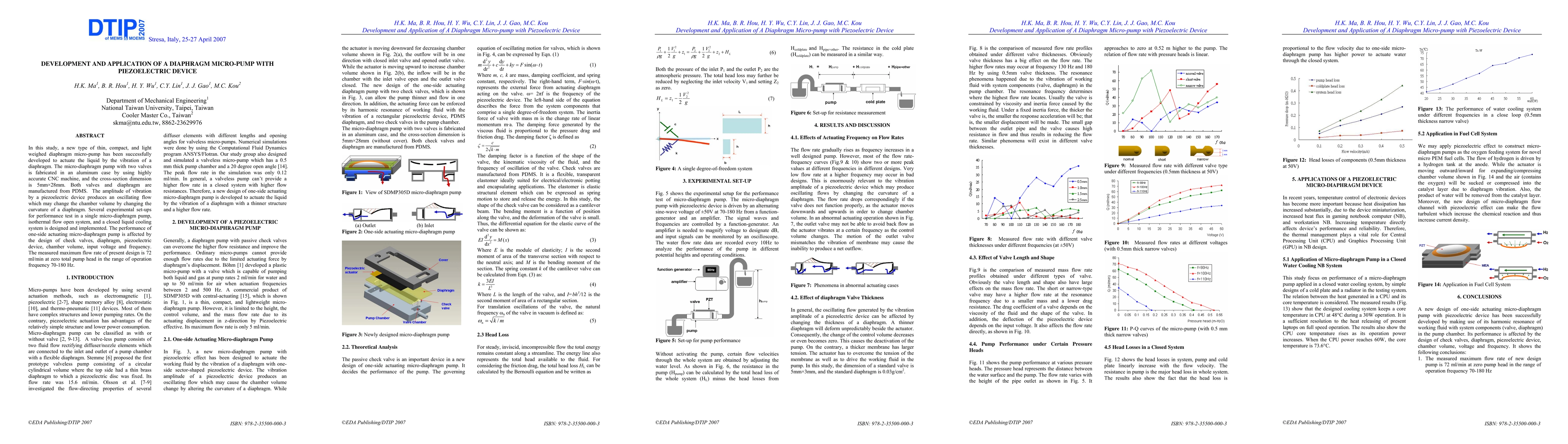 This study developed a compact diaphragm micro-pump actuated by a piezoelectric device, achieving a maximum flow rate of 72 ml/min at zero pump head. The micro-pump, with valves and diaphragm made from PDMS, was tested in various systems to evaluate its performance.