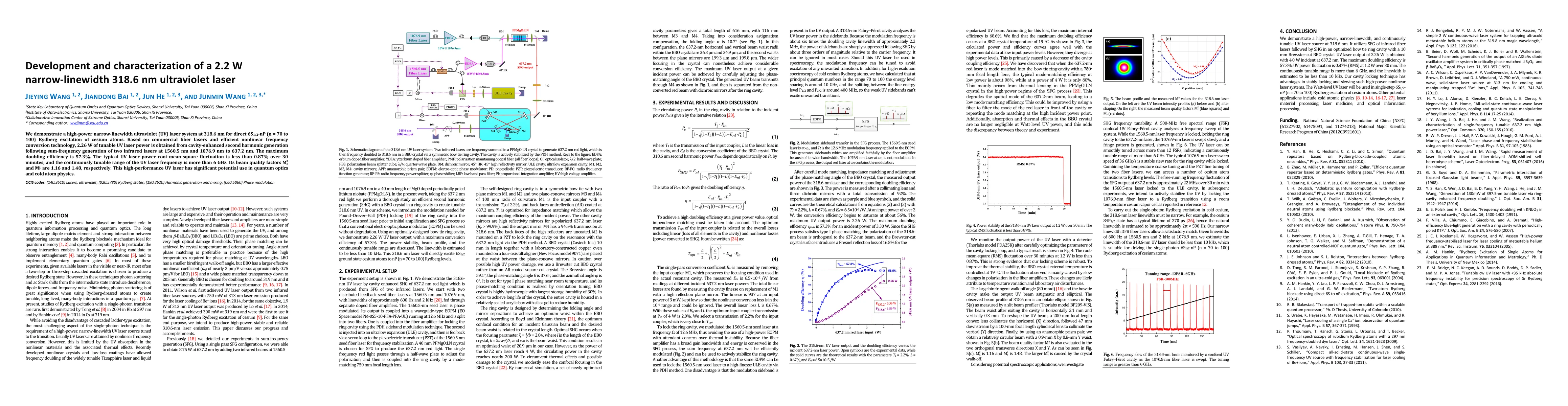 This research develops a 2.26 W narrow-linewidth UV laser at 318.6 nm via nonlinear frequency conversion, achieving high power and stability for Rydberg excitation of cesium atoms in quantum optics and cold atom physics applications. The laser exhibits high beam quality and a continuously tunable frequency range over 6 GHz.