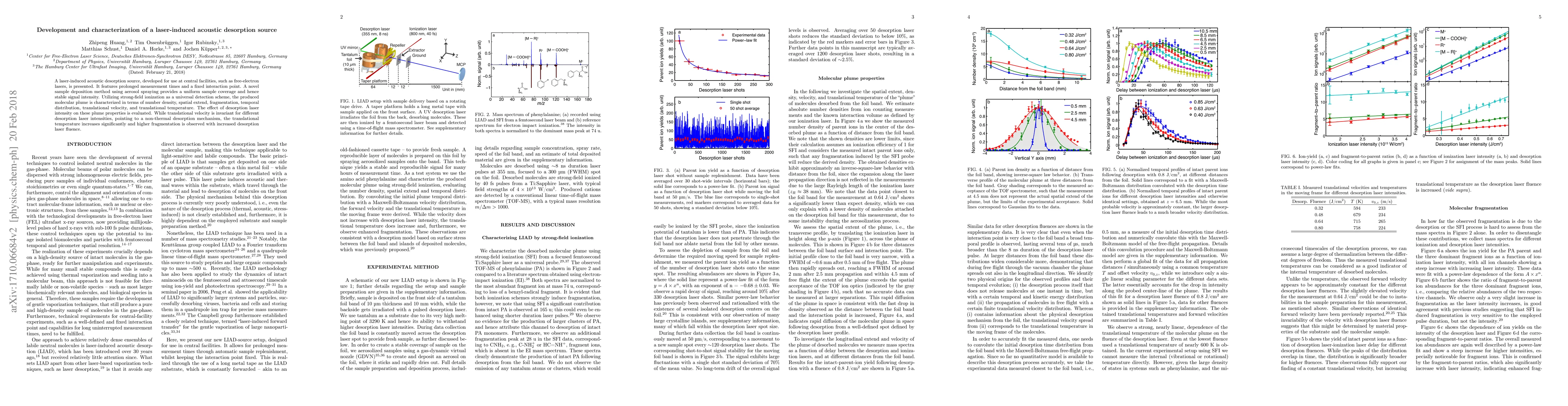 This paper introduces a laser-induced acoustic desorption source for central research facilities, employing aerosol spraying for uniform sample deposition. The study characterizes the molecular plume in terms of various properties, finding non-thermal desorption indicated by invariant translational velocity, while higher desorption laser fluence leads to increased translational temperature and fragmentation.