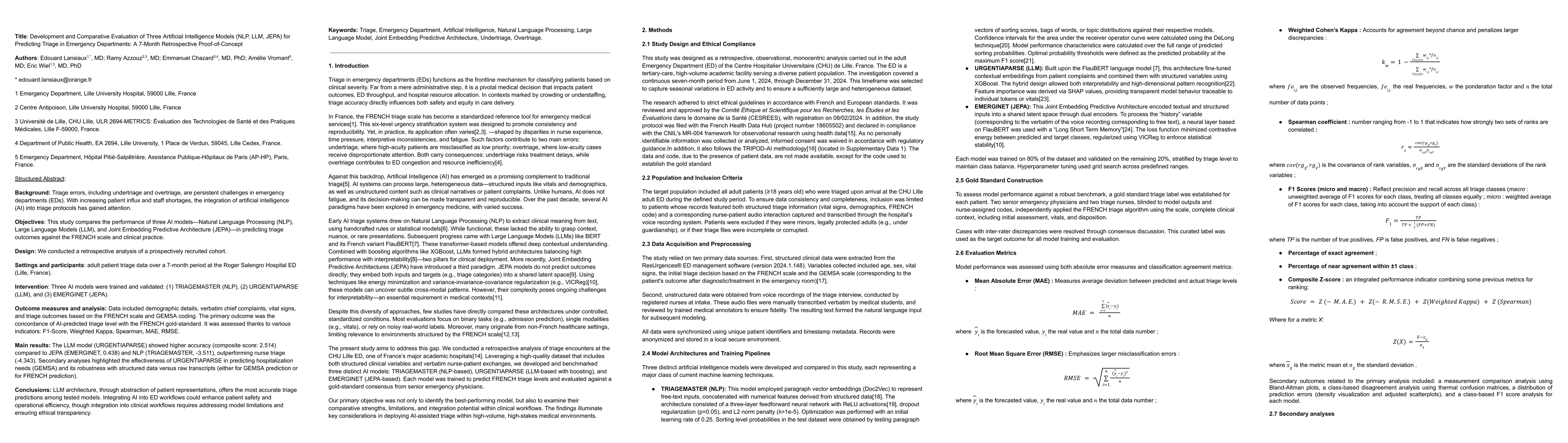 Triage errors, including undertriage and overtriage, are persistent challenges in emergency departments (EDs). With increasing patient influx and staff shortages, the integration of artificial intelligence (AI) into triage protocols has gained attention. This study compares the performance of three AI models [Natural Language Processing (NLP), Large Language Models (LLM), and Joint Embedding Predictive Architecture (JEPA)] in predicting triage outcomes against the FRENCH scale and clinical practice.We conducted a retrospective analysis of a prospectively recruited cohort gathering adult patient triage data over a 7-month period at the Roger Salengro Hospital ED (Lille, France). Three AI models were trained and validated : (1) TRIAGEMASTER (NLP), (2) URGENTIAPARSE (LLM), and (3) EMERGINET (JEPA). Data included demographic details, verbatim chief complaints, vital signs, and triage outcomes based on the FRENCH scale and GEMSA coding. The primary outcome was the concordance of AI-predicted triage level with the FRENCH gold-standard. It was assessed thanks to various indicators : F1-Score, Weighted Kappa, Spearman, MAE, RMSE. The LLM model (URGENTIAPARSE) showed higher accuracy (composite score: 2.514) compared to JEPA (EMERGINET, 0.438) and NLP (TRIAGEMASTER, -3.511), outperforming nurse triage (-4.343). Secondary analyses highlighted the effectiveness of URGENTIAPARSE in predicting hospitalization needs (GEMSA) and its robustness with structured data versus raw transcripts (either for GEMSA prediction or for FRENCH prediction). LLM architecture, through abstraction of patient representations, offers the most accurate triage predictions among tested models. Integrating AI into ED workflows could enhance patient safety and operational efficiency, though integration into clinical workflows requires addressing model limitations and ensuring ethical transparency.