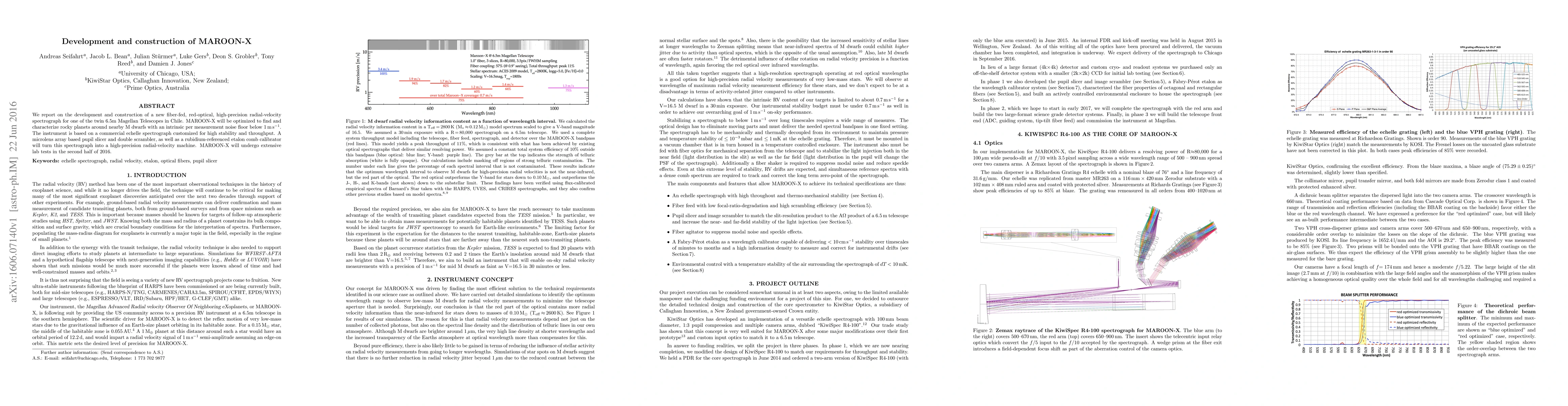 We report on the development and construction of a new fiber-fed, red-optical, high-precision radial-velocity spectrograph for one of the twin 6.5m Magellan Telescopes in Chile. MAROON-X will be optimized to find and characterize rocky planets around nearby M dwarfs with an intrinsic per measurement noise floor below 1 m/s. The instrument is based on a commercial echelle spectrograph customized for high stability and throughput. A microlens array based pupil slicer and double scrambler, as well as a rubidium-referenced etalon comb calibrator will turn this spectrograph into a high-precision radial-velocity machine. MAROON-X will undergo extensive lab tests in the second half of 2016.