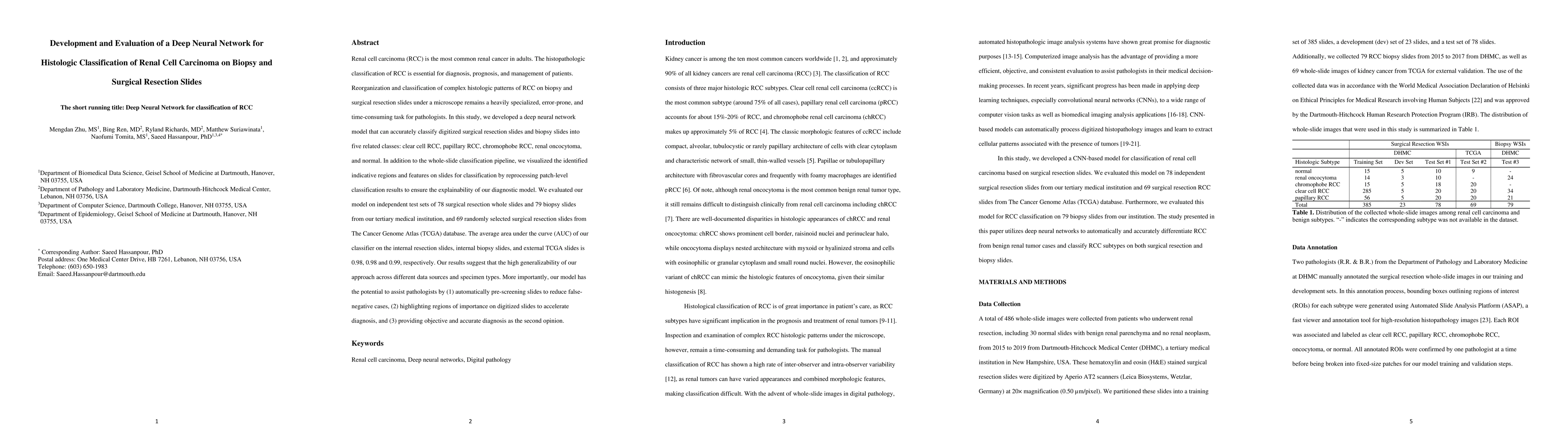 This study developed a deep neural network to classify renal cell carcinoma into five classes on biopsy and surgical resection slides, achieving high accuracy (AUC 0.98-0.99) across different datasets. The model also highlights important regions, aiding pathologists in diagnosis and potentially reducing false-negative cases.