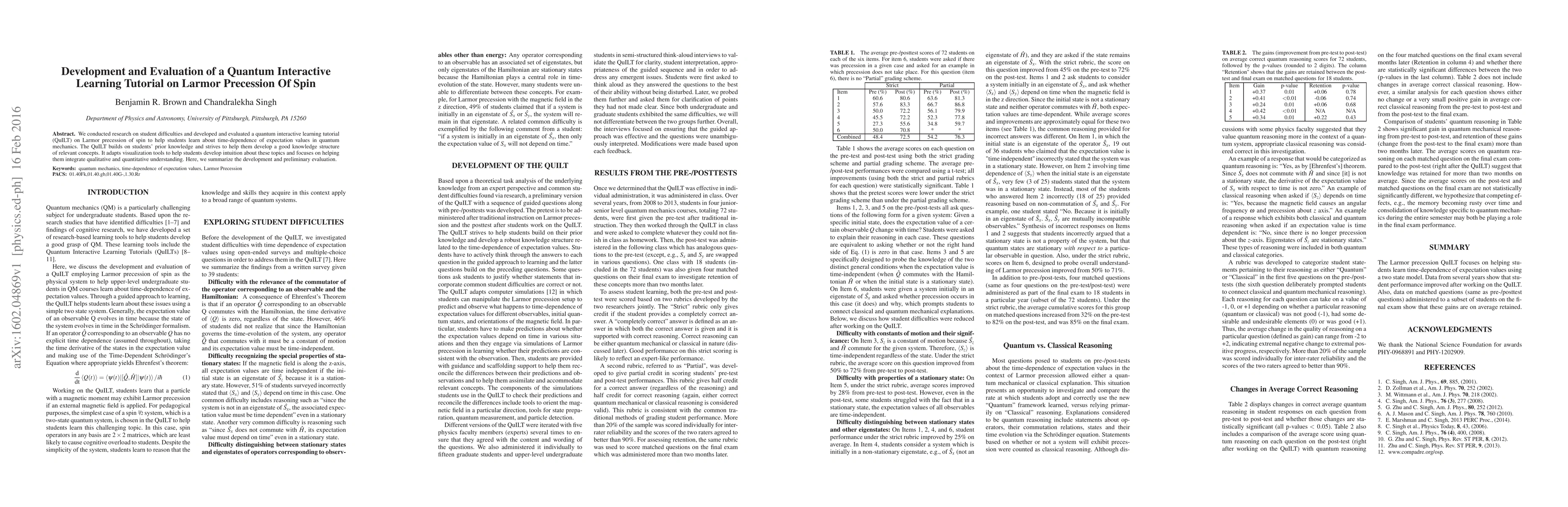 We conducted research on student difficulties and developed and evaluated a quantum interactive learning tutorial (QuILT) on Larmor precession of spin to help students learn about time-dependence of expectation values in quantum mechanics. The QuILT builds on students' prior knowledge and strives to help them develop a good knowledge structure of relevant concepts. It adapts visualization tools to help students develop intuition about these topics and focuses on helping them integrate qualitative and quantitative understanding. Here, we summarize the development and preliminary evaluation.