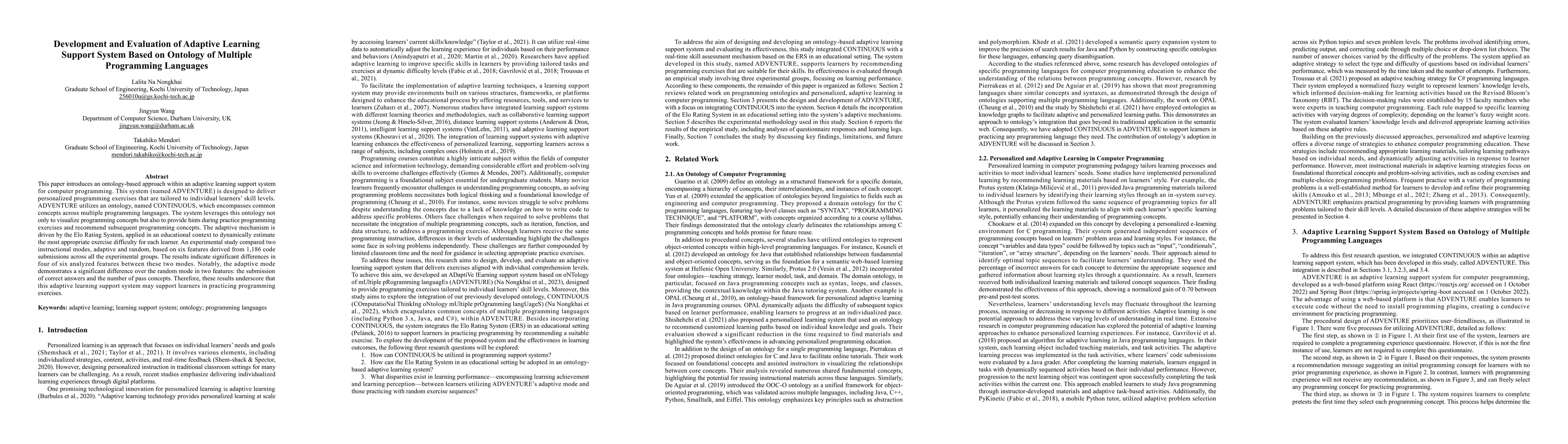 This paper introduces an ontology-based approach within an adaptive learning support system for computer programming. This system (named ADVENTURE) is designed to deliver personalized programming exercises that are tailored to individual learners' skill levels. ADVENTURE utilizes an ontology, named CONTINUOUS, which encompasses common concepts across multiple programming languages. The system leverages this ontology not only to visualize programming concepts but also to provide hints during practice programming exercises and recommend subsequent programming concepts. The adaptive mechanism is driven by the Elo Rating System, applied in an educational context to dynamically estimate the most appropriate exercise difficulty for each learner. An experimental study compared two instructional modes, adaptive and random, based on six features derived from 1,186 code submissions across all the experimental groups. The results indicate significant differences in four of six analyzed features between these two modes. Notably, the adaptive mode demonstrates a significant difference over the random mode in two features, the submission of correct answers and the number of pass concepts. Therefore, these results underscore that this adaptive learning support system may support learners in practicing programming exercises.