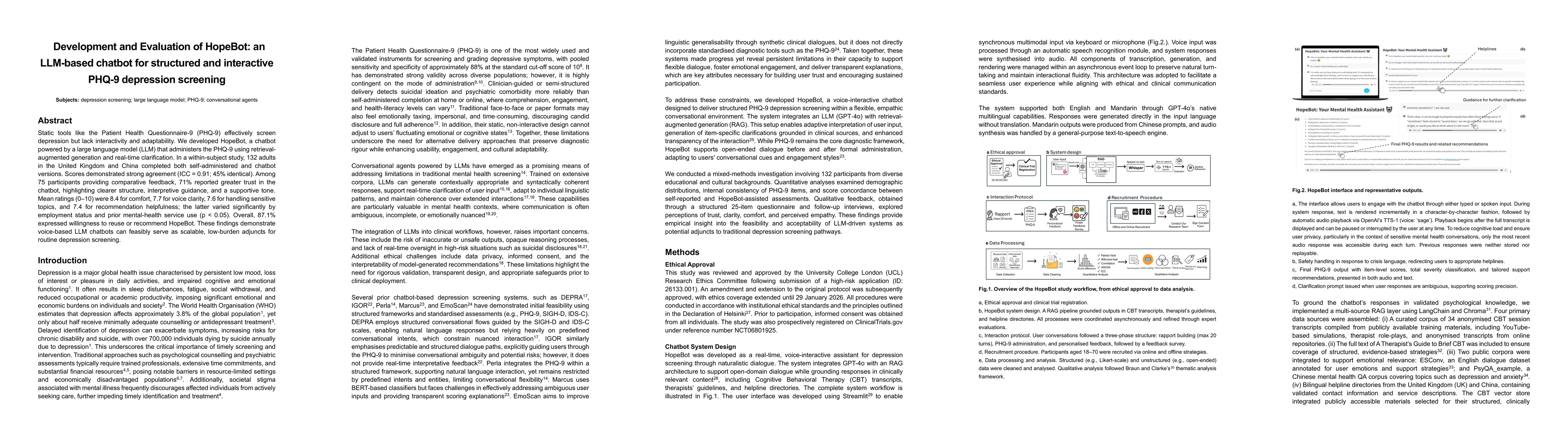 Static tools like the Patient Health Questionnaire-9 (PHQ-9) effectively screen depression but lack interactivity and adaptability. We developed HopeBot, a chatbot powered by a large language model (LLM) that administers the PHQ-9 using retrieval-augmented generation and real-time clarification. In a within-subject study, 132 adults in the United Kingdom and China completed both self-administered and chatbot versions. Scores demonstrated strong agreement (ICC = 0.91; 45% identical). Among 75 participants providing comparative feedback, 71% reported greater trust in the chatbot, highlighting clearer structure, interpretive guidance, and a supportive tone. Mean ratings (0-10) were 8.4 for comfort, 7.7 for voice clarity, 7.6 for handling sensitive topics, and 7.4 for recommendation helpfulness; the latter varied significantly by employment status and prior mental-health service use (p < 0.05). Overall, 87.1% expressed willingness to reuse or recommend HopeBot. These findings demonstrate voice-based LLM chatbots can feasibly serve as scalable, low-burden adjuncts for routine depression screening.