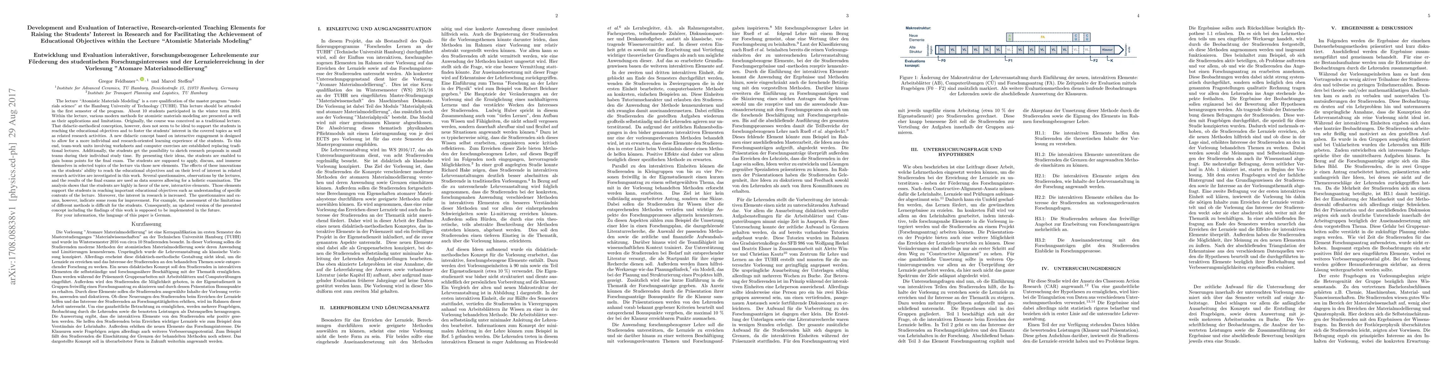 This study introduces interactive, research-oriented teaching methods in the "Atomistic Materials Modeling" lecture to enhance student engagement and achievement of educational goals. The new approach, featuring team-work and research proposal exercises, is shown to increase student interest and support learning outcomes, though some areas for improvement remain, such as understanding method limitations.
