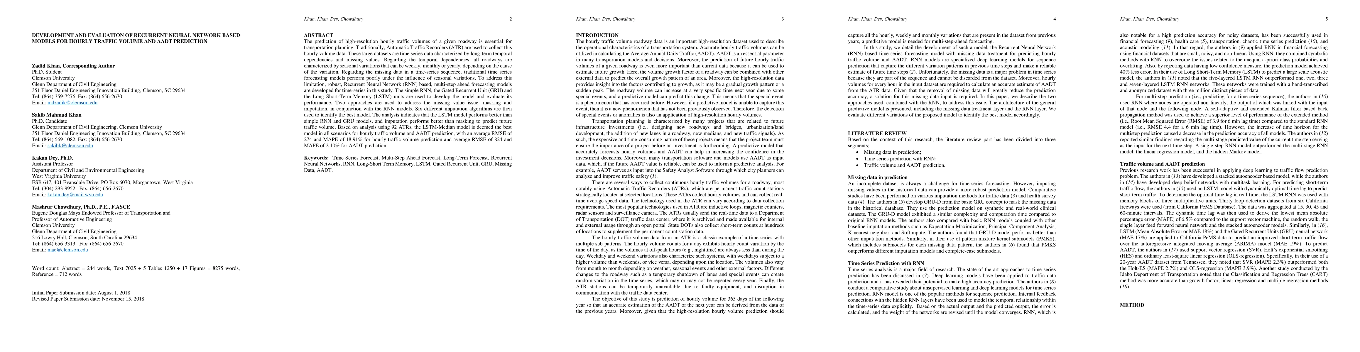 This study develops Recurrent Neural Network (RNN) based models for predicting hourly traffic volumes and Annual Average Daily Traffic (AADT), addressing challenges of temporal dependencies and missing data. The LSTM model outperforms the simple RNN and GRU models, with imputation methods proving more effective than masking for handling missing values, resulting in the LSTM-Median model as the best performer.