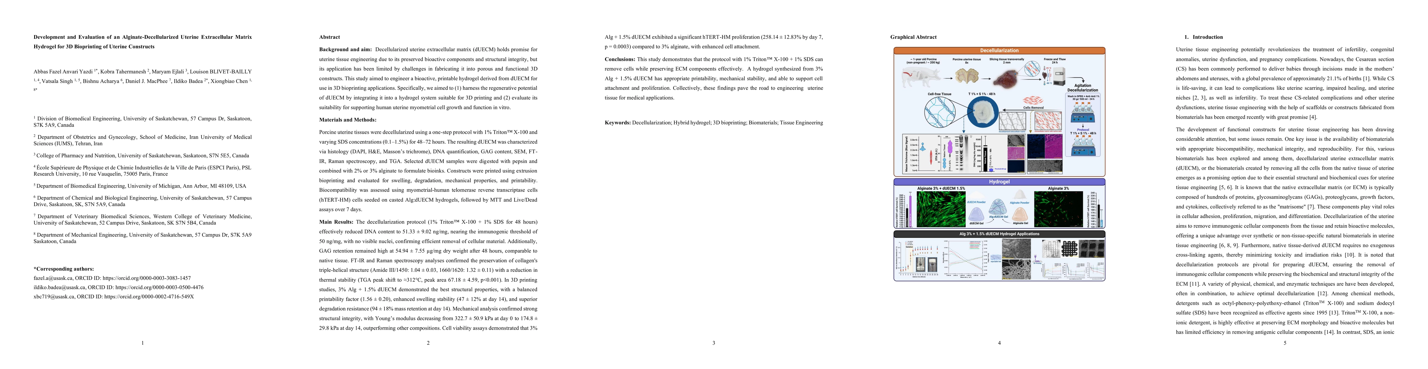 Background and Aim: Decellularized uterine extracellular matrix (dUECM) offers a promising bioactive scaffold for uterine tissue engineering, but its application in 3D constructs has been limited by fabrication challenges. This study aimed to develop a printable, bioactive hydrogel from dUECM suitable for 3D bioprinting and to evaluate its ability to support human uterine myometrial cell growth in vitro. Materials and Methods: Porcine uterine tissues were decellularized using 1 percent Triton X-100 and 0.1 to 1.5 percent SDS for 48 to 72 hours. The resulting dUECM was assessed via histology, DNA and GAG quantification, scanning electron microscopy, FTIR, Raman spectroscopy, and thermogravimetric analysis. Selected dUECM samples were digested with pepsin and blended with 2 or 3 percent alginate to create bioinks. Constructs were printed using extrusion-based bioprinting and evaluated for swelling, degradation, mechanical properties, and printability. Biocompatibility was tested by seeding hTERT-HM cells onto cast hydrogels and performing MTT and Live/Dead assays over seven days. Results: The optimal protocol (1 percent Triton X-100 and 1 percent SDS for 48 hours) reduced DNA to 51.3 ng per mg, while retaining 54.9 micrograms per mg of GAGs. FTIR and Raman spectroscopy confirmed collagen preservation, while thermal stability was moderately reduced. The 3 percent alginate with 1.5 percent dUECM formulation showed superior printability, swelling stability, degradation resistance, and mechanical strength. Cell proliferation reached 258 percent by day 7, significantly outperforming alginate alone. Conclusion: The optimized dUECM hydrogel supports printability, mechanical performance, and cell viability, offering a robust platform for uterine tissue engineering.