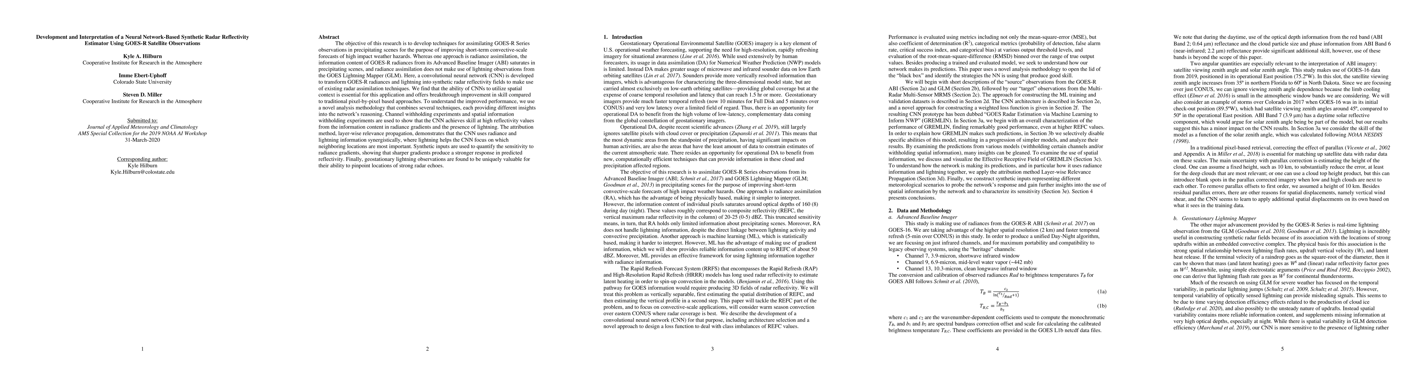 The objective of this research is to develop techniques for assimilating GOES-R Series observations in precipitating scenes for the purpose of improving short-term convective-scale forecasts of high impact weather hazards. Whereas one approach is radiance assimilation, the information content of GOES-R radiances from its Advanced Baseline Imager (ABI) saturates in precipitating scenes, and radiance assimilation does not make use of lightning observations from the GOES Lightning Mapper (GLM). Here, a convolutional neural network (CNN) is developed to transform GOES-R radiances and lightning into synthetic radar reflectivity fields to make use of existing radar assimilation techniques. We find that the ability of CNNs to utilize spatial context is essential for this application and offers breakthrough improvement in skill compared to traditional pixel-by-pixel based approaches. To understand the improved performance, we use a novel analysis methodology that combines several techniques, each providing different insights into the network's reasoning. Channel withholding experiments and spatial information withholding experiments are used to show that the CNN achieves skill at high reflectivity values from the information content in radiance gradients and the presence of lightning. The attribution method, layer-wise relevance propagation, demonstrates that the CNN uses radiance and lightning information synergistically, where lightning helps the CNN focus on which neighboring locations are most important. Synthetic inputs are used to quantify the sensitivity to radiance gradients, showing that sharper gradients produce a stronger response in predicted reflectivity. Finally, geostationary lightning observations are found to be uniquely valuable for their ability to pinpoint locations of strong radar echoes.