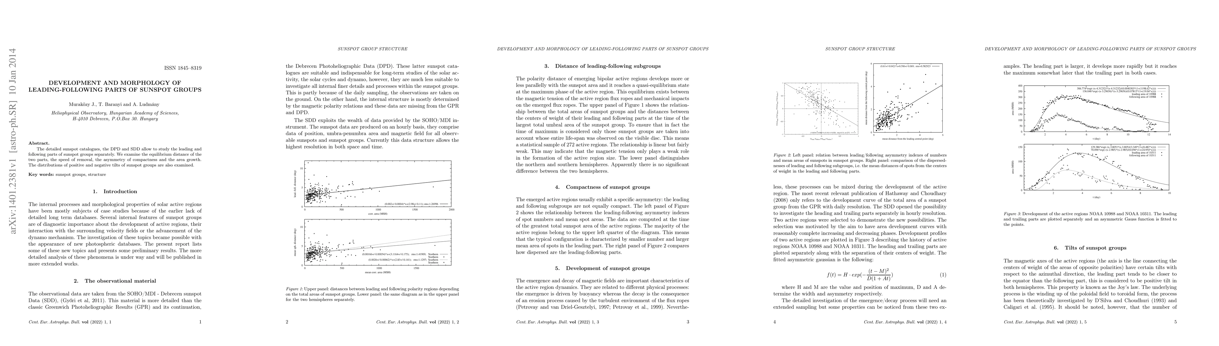 The detailed sunspot catalogues, the DPD and SDD allow to study the leading and following parts of sunspot groups separately. We examine the equilibrium distance of the two parts, the speed of removal, the asymmetry of compactness and the area growth. The distributions of positive and negative tilts of sunspot groups are also examined.