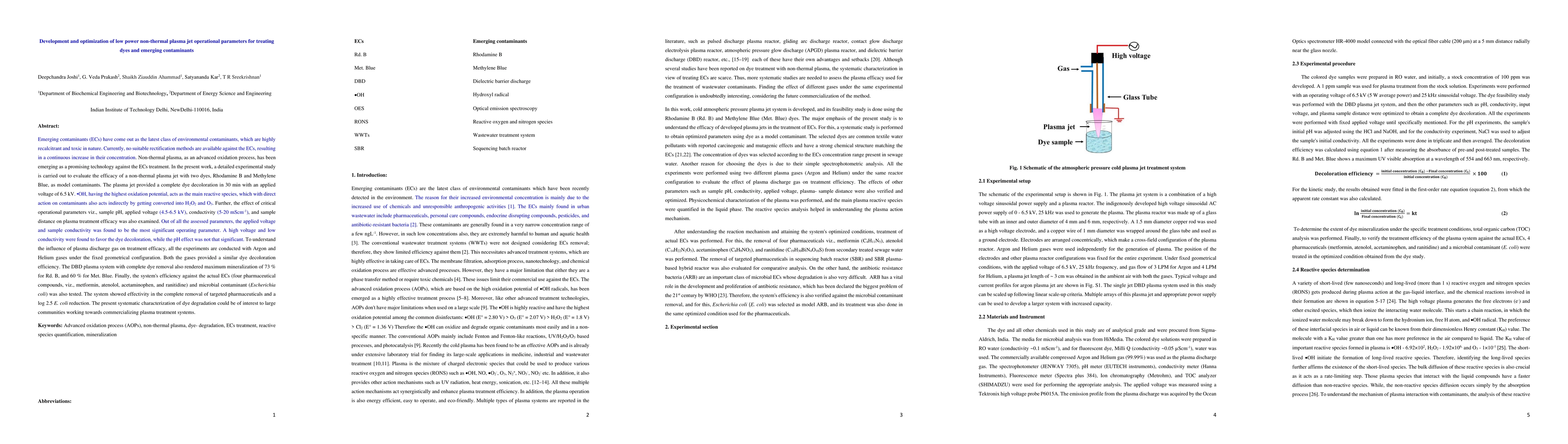 Emerging contaminants (ECs) have come out as the latest class of environmental contaminants, which are highly recalcitrant and toxic in nature. Currently, no suitable rectification methods are available against the ECs, resulting in a continuous increase in their concentration. Non-thermal plasma, as an advanced oxidation process, has been emerging as a promising technology against the ECs treatment. In the present work, a detailed experimental study is carried out to evaluate the efficacy of a non-thermal plasma jet with two dyes, Rhodamine B and Methylene Blue, as model contaminants. The plasma jet provided a complete dye decoloration in 30 min with an applied voltage of 6.5 kV. .OH, having the highest oxidation potential, acts as the main reactive species, which with direct action on contaminants also acts indirectly by getting converted into H2O2 and O3. Further, the effect of critical operational parameters viz., sample pH, applied voltage (4.5-6.5 kV), conductivity (5-20 mScm-1), and sample distance on plasma treatment efficacy was also examined. Out of all the assessed parameters, the applied voltage and sample conductivity was found to be the most significant operating parameter. A high voltage and low conductivity were found to favor the dye decoloration, while the pH effect was not that significant. To understand the influence of plasma discharge gas on treatment efficacy, all the experiments are conducted with Argon and Helium gases under the fixed geometrical configuration. Both the gases provided a similar dye decoloration efficiency. The DBD plasma system with complete dye removal also rendered maximum mineralization of 73 % for Rd. B, and 60 % for Met. Blue. Finally, the system's efficiency against the actual ECs (four pharmaceutical compounds, viz., metformin, atenolol, acetaminophen, and ranitidine) and microbial contaminant (Escherichia coli) was also tested.