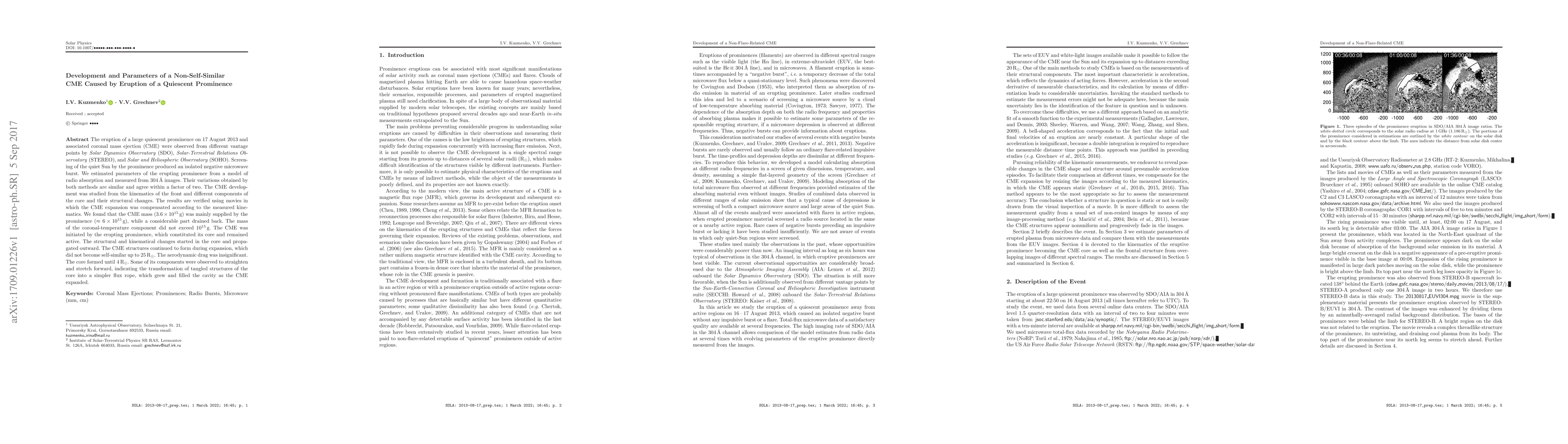 This paper investigates the eruption of a quiescent prominence on 17 August 2013, resulting in a non-self-similar coronal mass ejection (CME) observed by multiple solar observatories. The CME's mass, primarily supplied by the prominence, showed continuous structural changes and formation during expansion, with aerodynamic drag remaining insignificant.