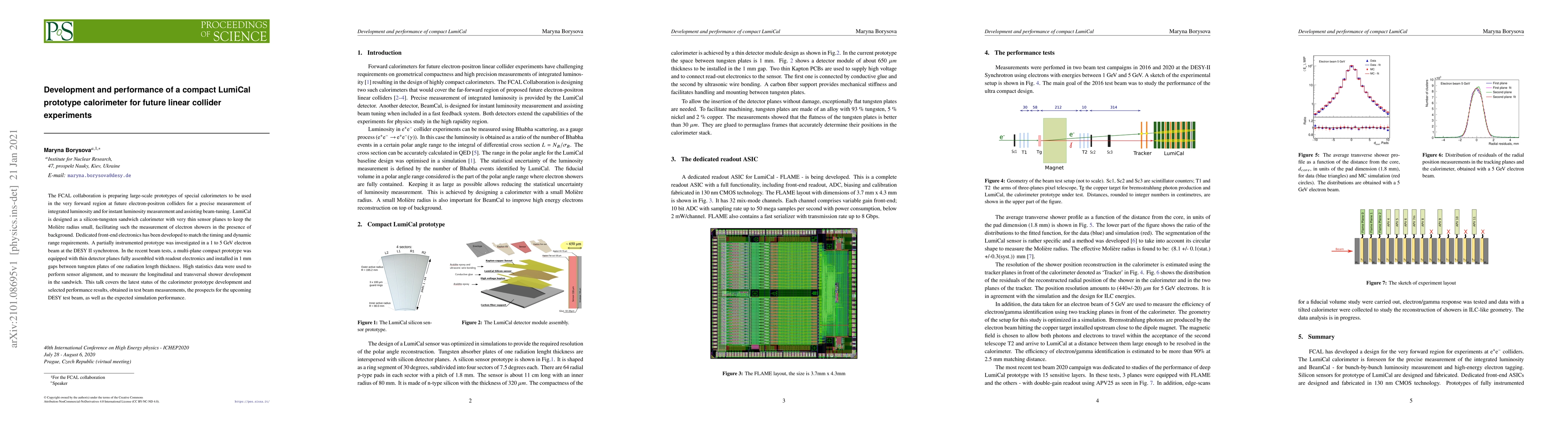 The FCAL collaboration has developed a compact LumiCal prototype calorimeter designed for precise luminosity measurements in future linear collider experiments. Initial test beam results show promising performance in electron shower measurements, with ongoing efforts to further refine the prototype for upcoming tests.