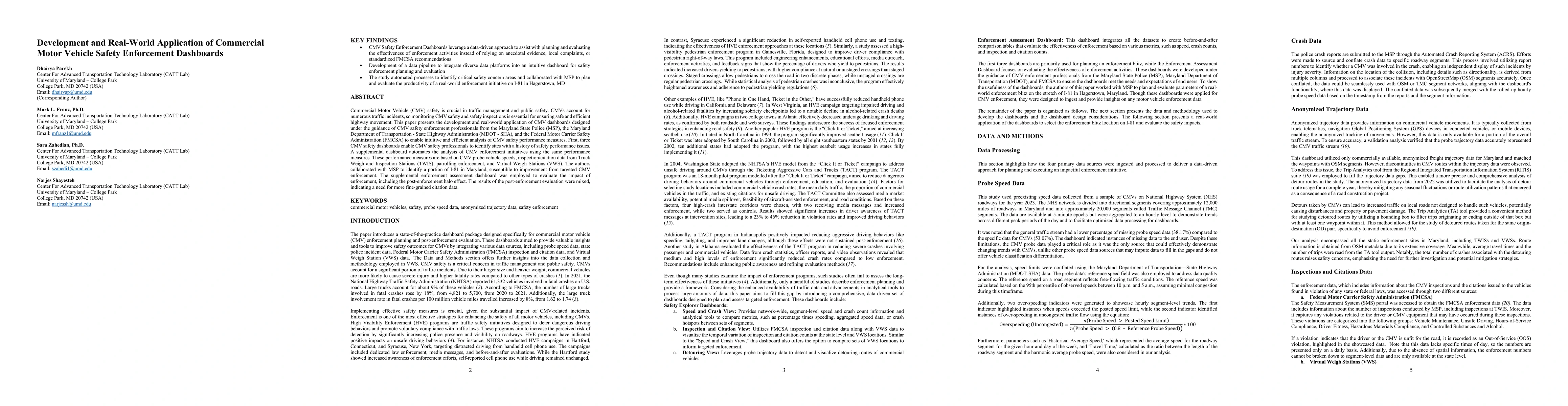 Commercial Motor Vehicle (CMV) safety is crucial in traffic management and public safety. CMVs account for numerous traffic incidents, so monitoring CMV safety and safety inspections is essential for ensuring safe and efficient highway movement. This paper presents the development and real-world application of CMV dashboards designed under the guidance of CMV safety enforcement professionals from the Maryland State Police (MSP), the Maryland Department of Transportation - State Highway Administration (MDOT - SHA), and the Federal Motor Carrier Safety Administration (FMCSA) to enable intuitive and efficient analysis of CMV safety performance measures. First, three CMV safety dashboards enable CMV safety professionals to identify sites with a history of safety performance issues. A supplemental dashboard automates the analysis of CMV enforcement initiatives using the same performance measures. These performance measures are based on CMV probe vehicle speeds, inspection/citation data from Truck Weigh and Inspection Stations (TWIS), patrolling enforcement, and Virtual Weigh Stations (VWS). The authors collaborated with MSP to identify a portion of I-81 in Maryland, susceptible to improvement from targeted CMV enforcement. The supplemental enforcement assessment dashboard was employed to evaluate the impact of enforcement, including the post-enforcement halo effect. The results of the post-enforcement evaluation were mixed, indicating a need for more fine-grained citation data.