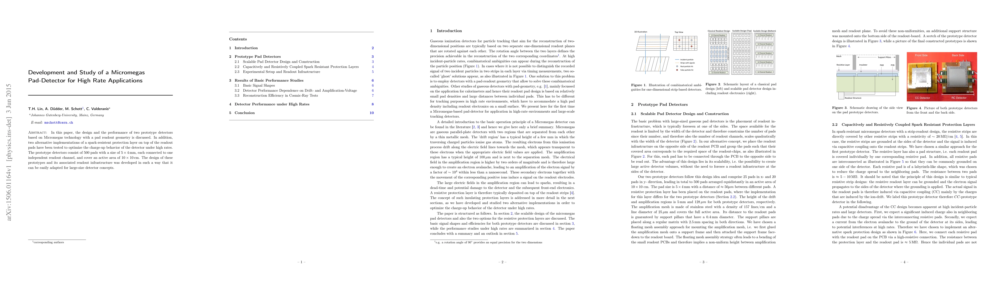 In this paper, the design and the performance of two prototype detectors based on Micromegas technology with a pad readout geometry is discussed. In addition, two alternative implementations of a spark-resistent protection layer on top of the readout pads have been tested to optimize the charge-up behavior of the detector under high rates. The prototype detectors consist of 500 pads with a size of 5x4 mm, each connected to one independent readout channel, and cover an active area of 10x10 cm. The design of these prototypes and its associated readout infrastructure was developed in such a way that it can be easily adapted for large-size detector concepts.