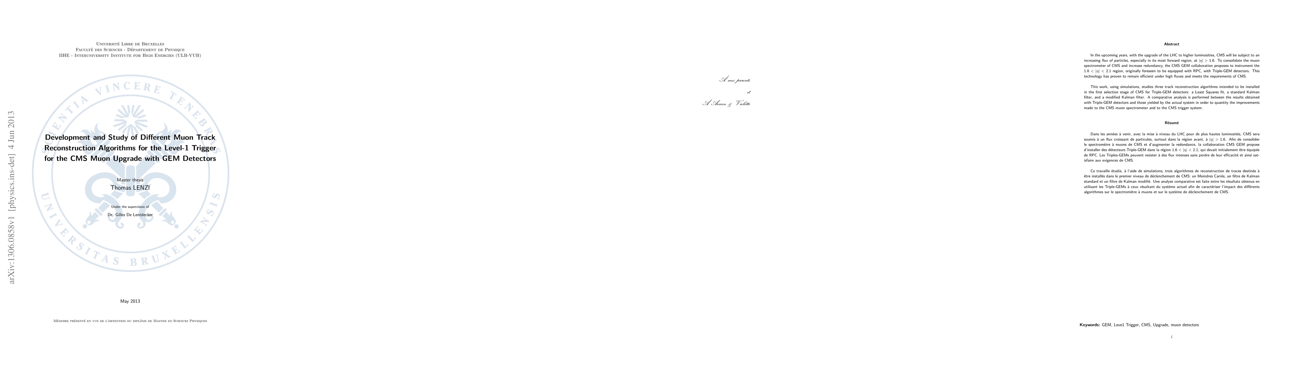 In the upcoming years, with the upgrade of the LHC to higher luminosities, CMS will be subject to an increasing flux of particles, especially in its most forward region, at | \eta | > 1.6. To consolidate the muon spectrometer of CMS and increase redundancy, the CMS GEM collaboration proposes to instrument the 1.6 < | \eta | < 2.1 region, originally foreseen to be equipped with RPC, with Triple-GEM detectors. This technology has proven to remain efficient under high fluxes and meets the requirements of CMS. This work, using simulations, studies three track reconstruction algorithms intended to be installed in the first selection stage of CMS for Triple-GEM detectors: a Least Squares fit, a standard Kalman filter, and a modified Kalman filter. A comparative analysis is performed between the results obtained with Triple-GEM detectors and those yielded by the actual system in order to quantity the improvements made to the CMS muon spectrometer and to the CMS trigger system.