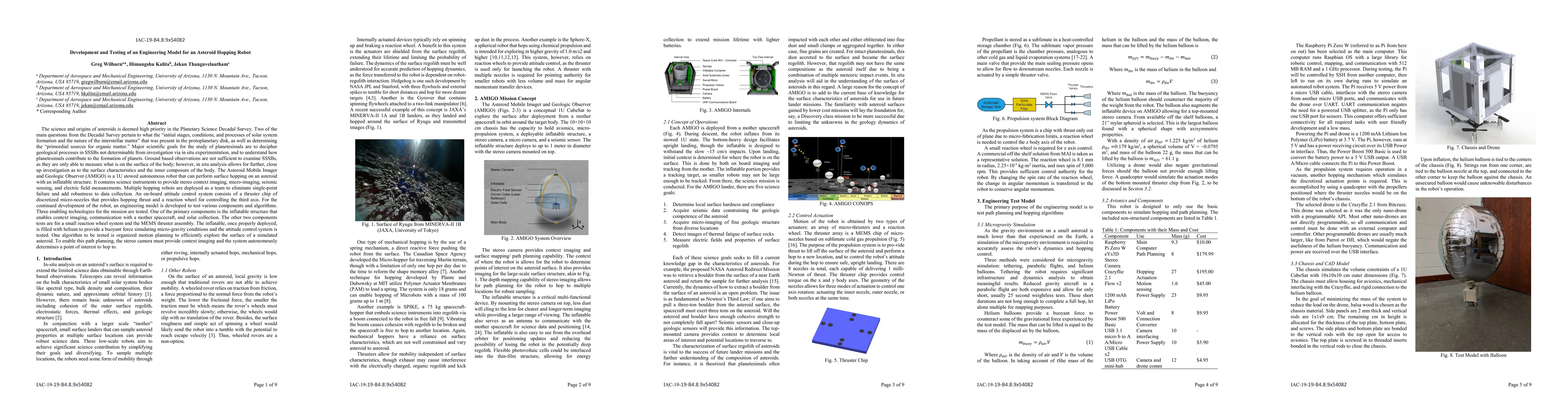 The science and origins of asteroids is deemed high priority in the Planetary Science Decadal Survey. Two of the main questions from the Decadal Survey pertain to what the "initial stages, conditions, and processes of solar system formation and the nature of the interstellar matter" that was present in the protoplanetary disk, as well as determining the "primordial sources for organic matter." Major scientific goals for the study of planetesimals are to decipher geological processes in SSSBs not determinable from investigation via in situ experimentation, and to understand how planetesimals contribute to the formation of planets. Ground based observations are not sufficient to examine SSSBs, as they are only able to measure what is on the surface of the body; however, in situ analysis allows for further, close up investigation as to the surface characteristics and the inner composure of the body. The Asteroid Mobile Imager and Geologic Observer (AMIGO) is a 1U stowed autonomous robot that can perform surface hopping on an asteroid with an inflatable structure. It contains science instruments to provide stereo context imaging, micro-imaging, seismic sensing, and electric field measurements. Multiple hopping robots are deployed as a team to eliminate single-point failure and add robustness to data collection. An on-board attitude control system consists of a thruster chip of discretized micro-nozzles that provides hopping thrust and a reaction wheel for controlling the third axis. For the continued development of the robot, an engineering model is developed to test various components and algorithms.