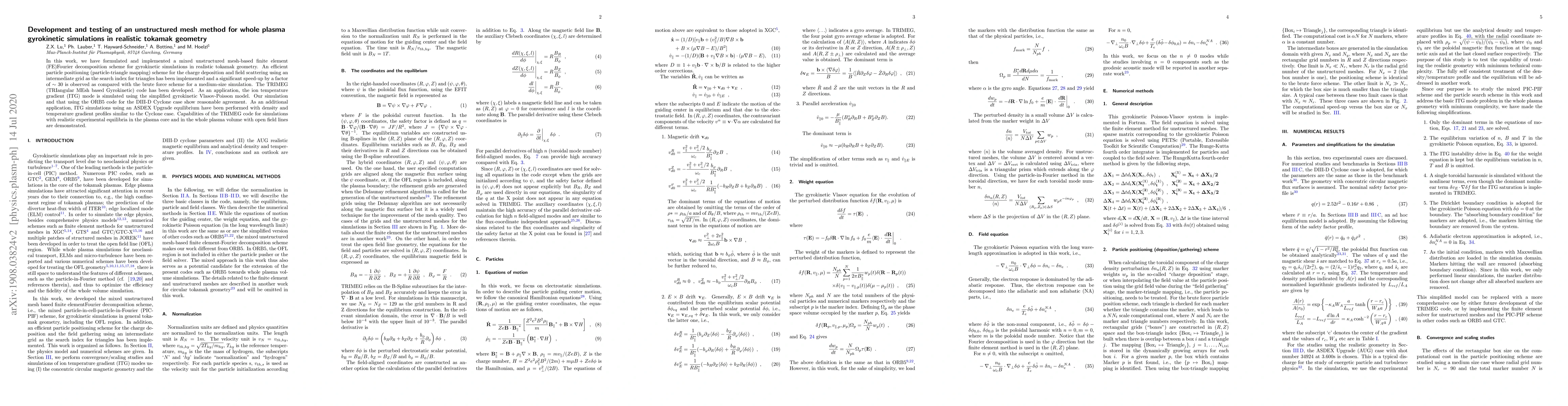This paper develops and tests a mixed unstructured mesh-based finite element method for gyrokinetic simulations in tokamak geometry, achieving a significant speed-up of ~30x. The TRIMEG code is applied to simulate the ion temperature gradient mode, showing reasonable agreement with existing models.