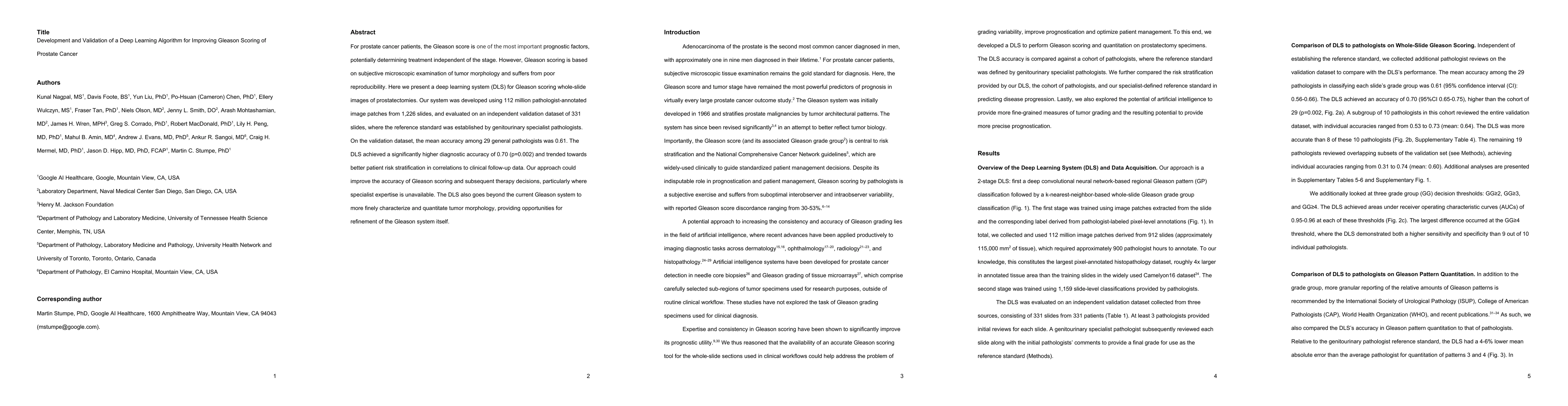 This paper develops and validates a deep learning algorithm to improve Gleason scoring for prostate cancer, achieving higher diagnostic accuracy (0.70) compared to general pathologists (0.61), and potentially enhancing treatment decisions where specialist expertise is limited.