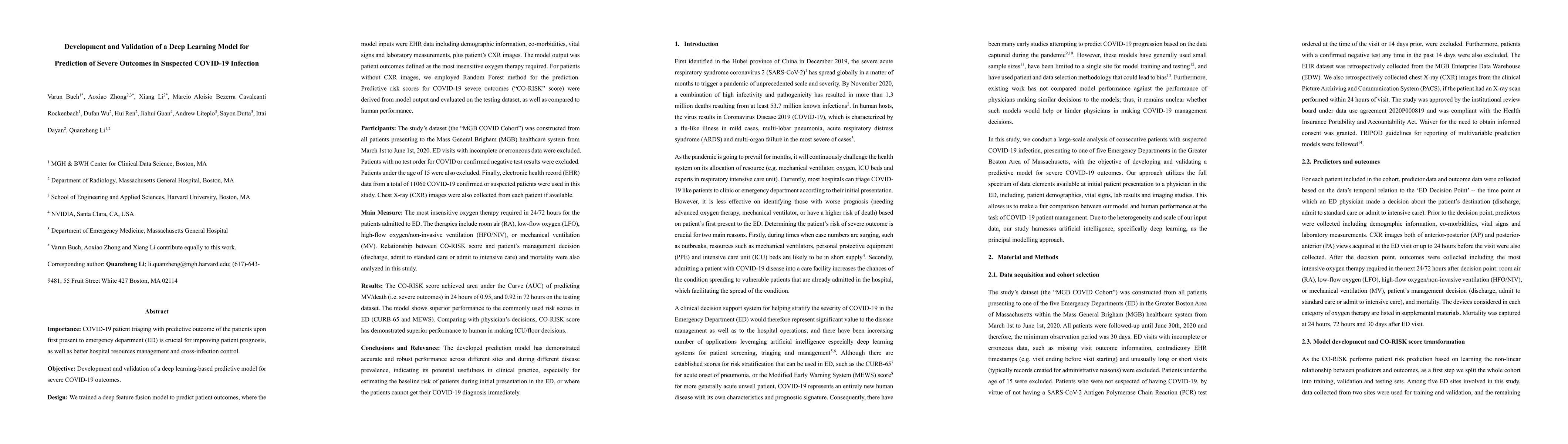 COVID-19 patient triaging with predictive outcome of the patients upon first present to emergency department (ED) is crucial for improving patient prognosis, as well as better hospital resources management and cross-infection control. We trained a deep feature fusion model to predict patient outcomes, where the model inputs were EHR data including demographic information, co-morbidities, vital signs and laboratory measurements, plus patient's CXR images. The model output was patient outcomes defined as the most insensitive oxygen therapy required. For patients without CXR images, we employed Random Forest method for the prediction. Predictive risk scores for COVID-19 severe outcomes ("CO-RISK" score) were derived from model output and evaluated on the testing dataset, as well as compared to human performance. The study's dataset (the "MGB COVID Cohort") was constructed from all patients presenting to the Mass General Brigham (MGB) healthcare system from March 1st to June 1st, 2020. ED visits with incomplete or erroneous data were excluded. Patients with no test order for COVID or confirmed negative test results were excluded. Patients under the age of 15 were also excluded. Finally, electronic health record (EHR) data from a total of 11060 COVID-19 confirmed or suspected patients were used in this study. Chest X-ray (CXR) images were also collected from each patient if available. Results show that CO-RISK score achieved area under the Curve (AUC) of predicting MV/death (i.e. severe outcomes) in 24 hours of 0.95, and 0.92 in 72 hours on the testing dataset. The model shows superior performance to the commonly used risk scores in ED (CURB-65 and MEWS). Comparing with physician's decisions, CO-RISK score has demonstrated superior performance to human in making ICU/floor decisions.