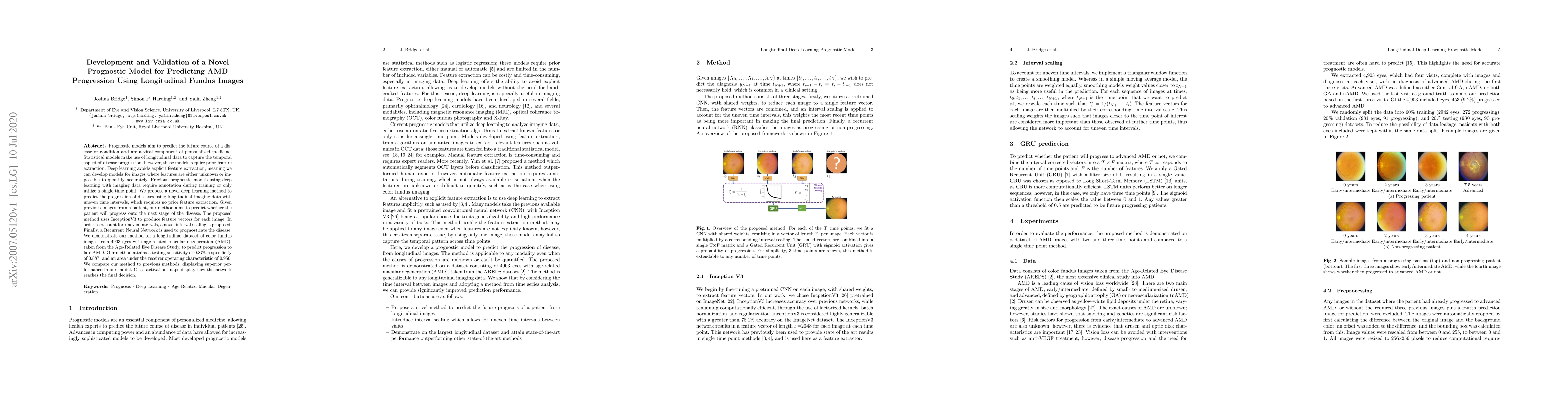 This paper proposes a novel deep learning method using longitudinal fundus images to predict the progression of age-related macular degeneration (AMD) without requiring prior feature extraction. The model, combining InceptionV3 and a Recurrent Neural Network with interval scaling, achieves high sensitivity, specificity, and ROC-AUC, outperforming previous methods.