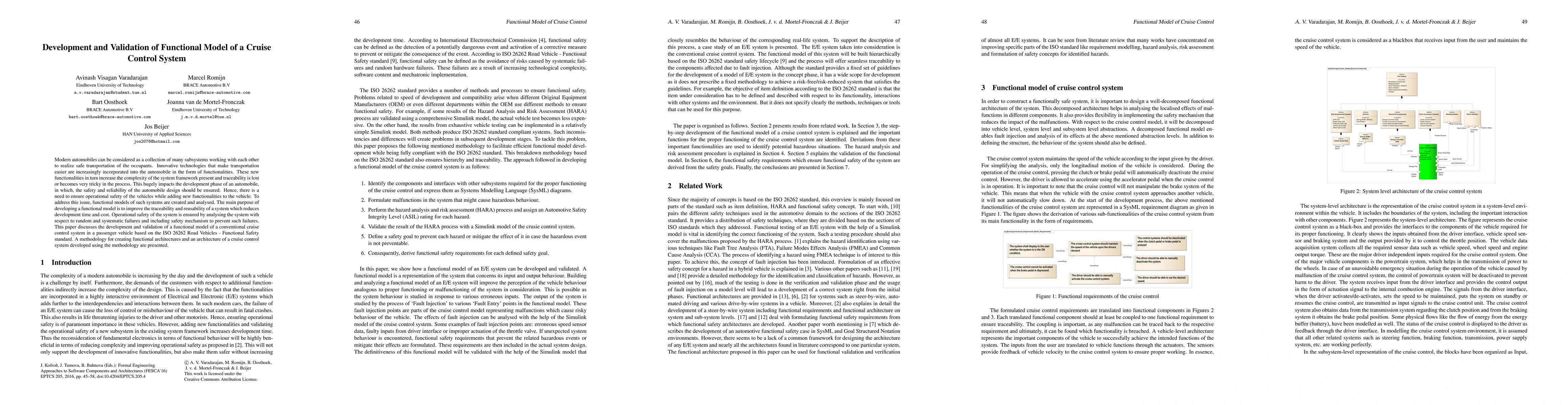 A functional model of a cruise control system was developed to improve safety and reliability in passenger vehicles. The model ensures operational safety through analysis of random and systematic failures and inclusion of safety mechanisms.