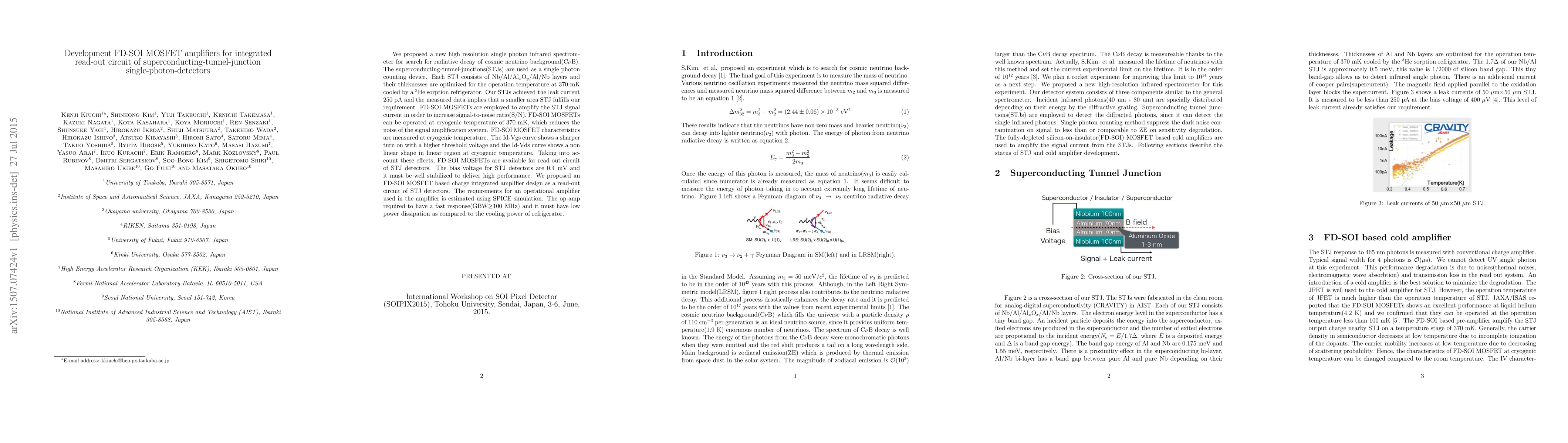 We proposed a new high resolution single photon infrared spectrometer for search for radiative decay of cosmic neutrino background(C$\nu$B). The superconducting-tunnel-junctions(STJs) are used as a single photoncounting device. Each STJ consists of Nb/Al/Al${}_{\mathrm{x}}$O${}_{\mathrm{y}}$/Al/Nb layers and their thicknesses are optimized for the operation temperature at 370 mK cooled by a ${}^{3}$He sorption refrigerator. Our STJs achieved the leak current 250 pA and the measured data implies that a smaller area STJ fulfills our requirement. FD-SOI MOSFETs are employed to amplify the STJ signal current in order to increase signal-to-noise ratio(S/N). FD-SOI MOSFETs can be operated at cryogenic temperature of 370 mK, which reduces the noise of the signal amplification system. FD-SOI MOSFET characteristics are measured at cryogenic temperature. The Id-Vgs curve shows a sharper turn on with a higher threshold voltage and the Id-Vds curve shows a non linear shape in linear region at cryogenic temperature. Taking into account these effects, FD-SOI MOSFETs are available for read-out circuit of STJ detectors. The bias voltage for STJ detectors are 0.4 mV and it must be well stabilized to deliver high performance. We proposed an FD-SOI MOSFET based charge integrated amplifier design as a read-out circuit of STJ detectors. The requirements for an operational amplifier used in the amplifier is estimated using SPICE simulation. The op-amp required to have a fast response(GBW$\geq$100 MHz) and it must have low power dissipation as compared to the cooling power of refrigerator.