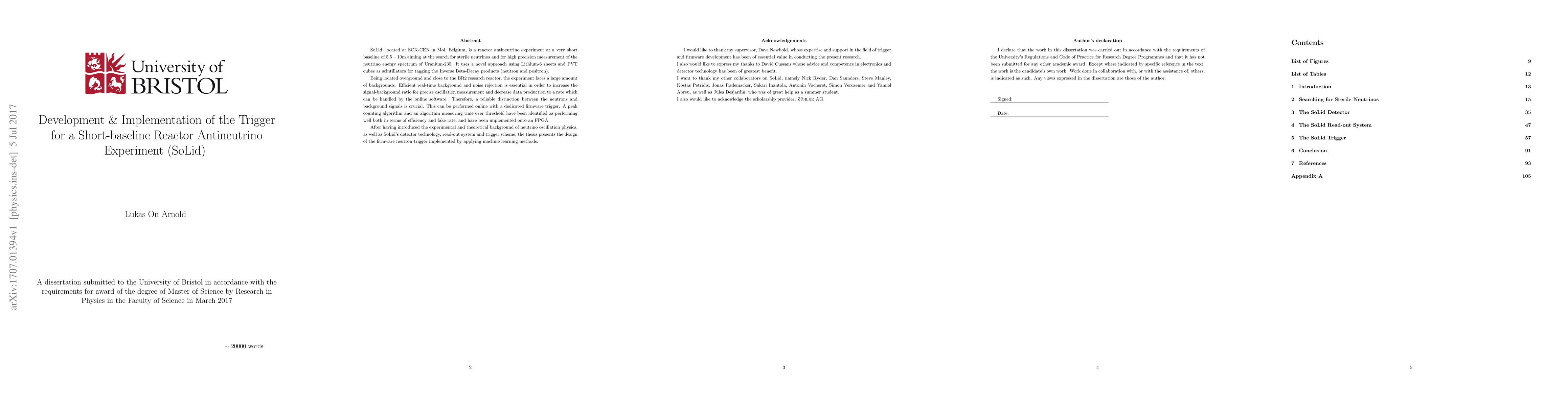 SoLid, located at SCK-CEN in Mol, Belgium, is a reactor antineutrino experiment at a very short baseline of 5.5 - 10m aiming at the search for sterile neutrinos and for high precision measurement of the neutrino energy spectrum of Uranium-235. It uses a novel approach using Lithium-6 sheets and PVT cubes as scintillators for tagging the Inverse Beta-Decay products (neutron and positron). Being located overground and close to the BR2 research reactor, the experiment faces a large amount of backgrounds. Efficient real-time background and noise rejection is essential in order to increase the signal-background ratio for precise oscillation measurement and decrease data production to a rate which can be handled by the online software. Therefore, a reliable distinction between the neutrons and background signals is crucial. This can be performed online with a dedicated firmware trigger. A peak counting algorithm and an algorithm measuring time over threshold have been identified as performing well both in terms of efficiency and fake rate, and have been implemented onto an FPGA. After having introduced the experimental and theoretical background of neutrino oscillation physics, as well as SoLid's detector technology, read-out system and trigger scheme, the thesis presents the design of the firmware neutron trigger implemented by applying machine learning methods.