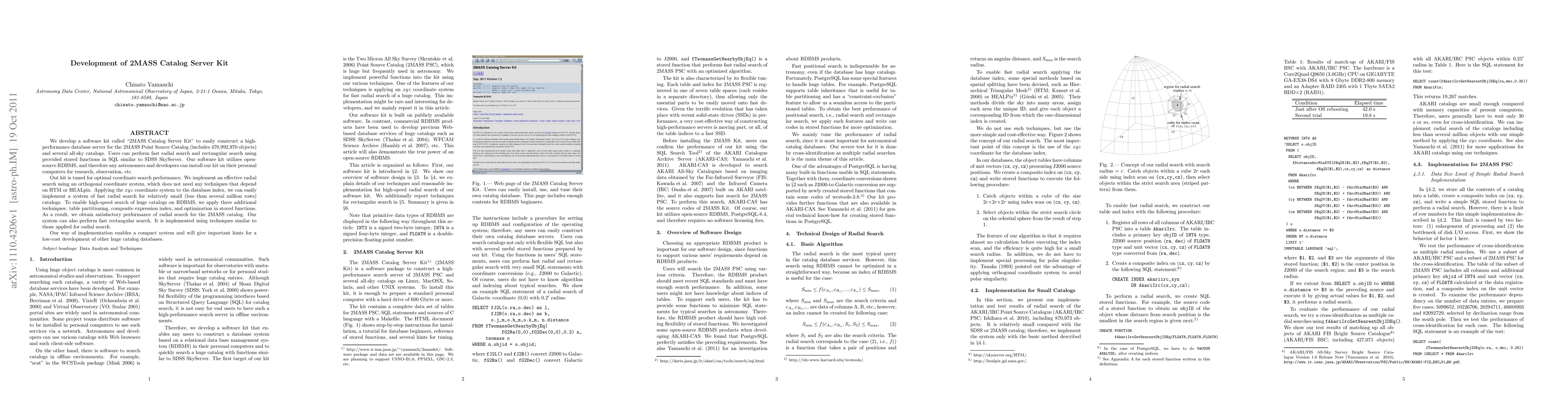 The "2MASS Catalog Server Kit" is a software tool designed to create a high-performance database server for the 2MASS Point Source Catalog, enabling fast radial and rectangular searches using SQL functions. It employs open-source RDBMS, table partitioning, composite expression index, and optimization techniques to achieve optimal search performance for large astronomical catalogs.