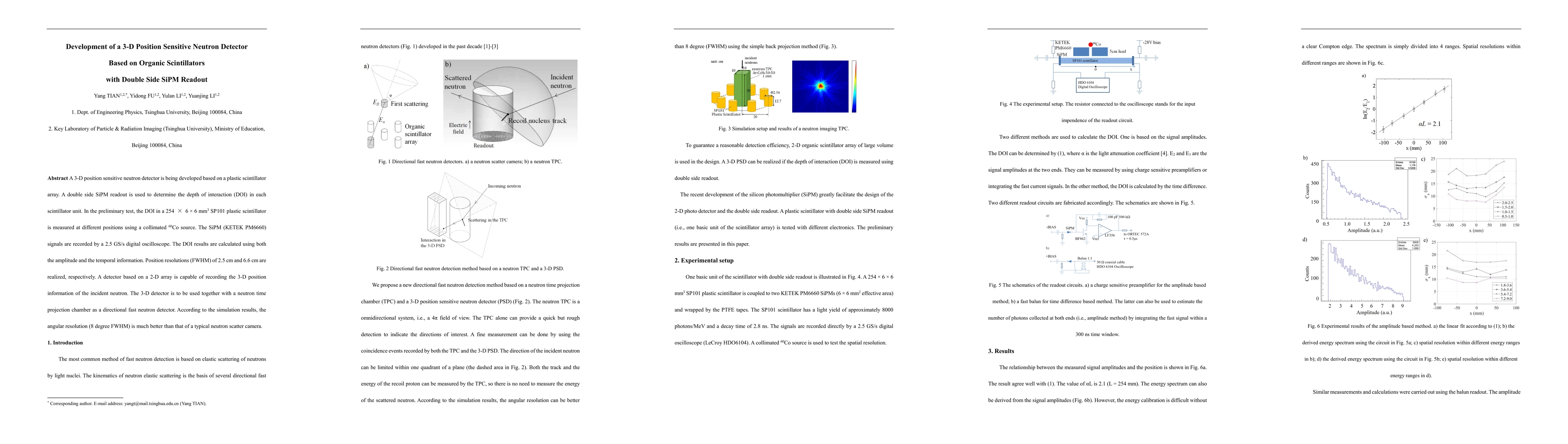A 3-D position sensitive neutron detector is being developed based on a plastic scintillator array. A double side SiPM readout is used to determine the depth of interaction (DOI) in each scintillator unit. In the preliminary test, the DOI in a 254 x 6 x 6 mm3 SP101 plastic scintillator is measured at different positions using a collimated Co-60 source. The SiPM (KETEK PM6660) signals are recorded by a 2.5 GS/s digital oscilloscope. The DOI results are calculated using both the amplitude and the temporal information. Position resolutions (FWHM) of 2.5 cm and 6.6 cm are realized, respectively. A detector based on a 2-D array is capable of recording the 3-D position information of the incident neutron. The 3-D detector is to be used together with a neutron time projection chamber as a directional fast neutron detector. According to the simulation results, the angular resolution (8 degree FWHM) is much better than that of a typical neutron scatter camera.
